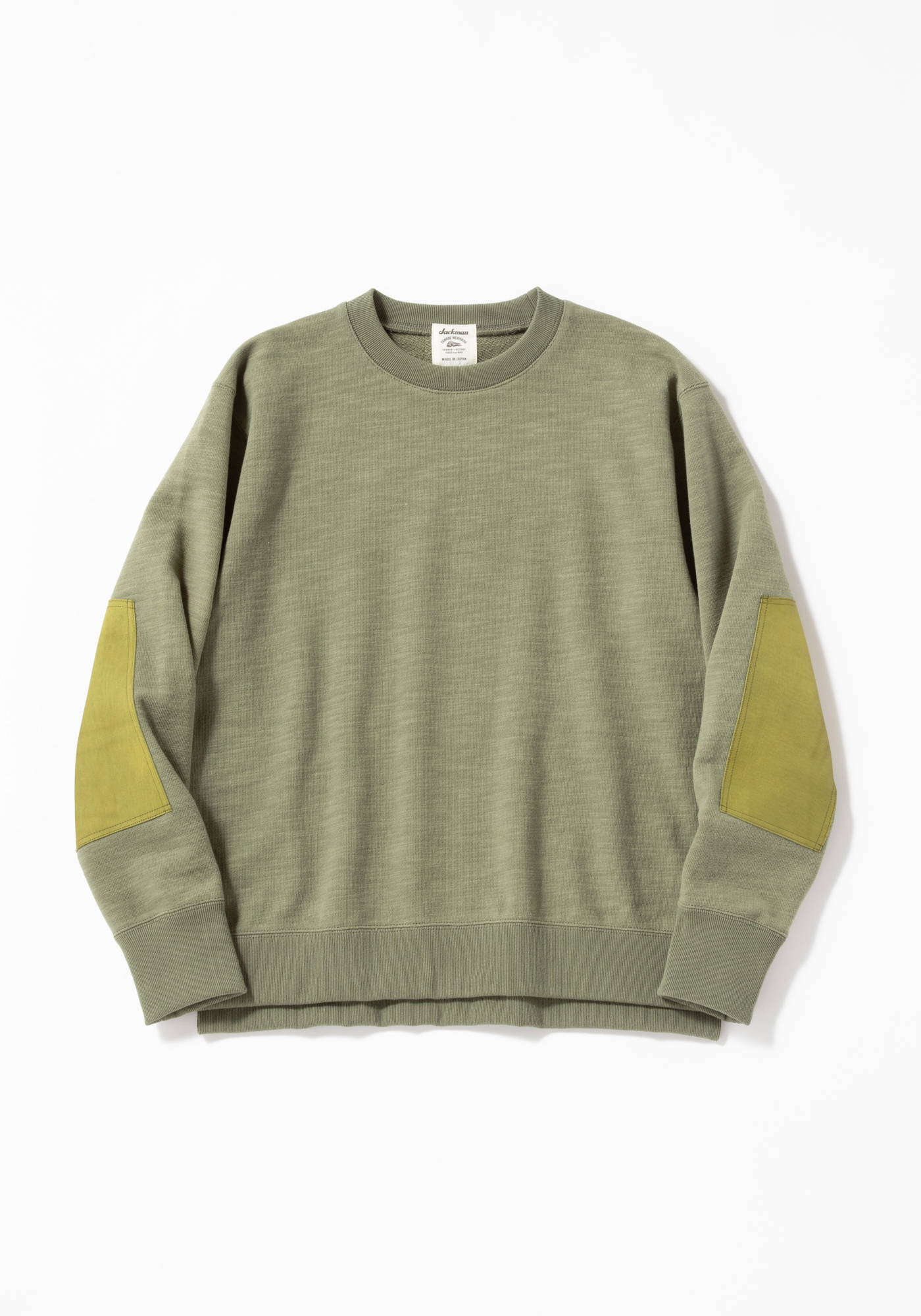 Armored crew neck with washable leather parts attached to the sleeves. The material is made from No.10 for the front yarn and thick No.7 for the back yarn, giving it a substantial and heavyweight feel. The sleeves are set in raglan style, the stitching is elaborately covered so that the sewing thread does not show on the surface, and the hem rib has a stepped slit specification. From the mid-1800s to the end of the 1800s, "leather" was often used as a reinforcement material.
