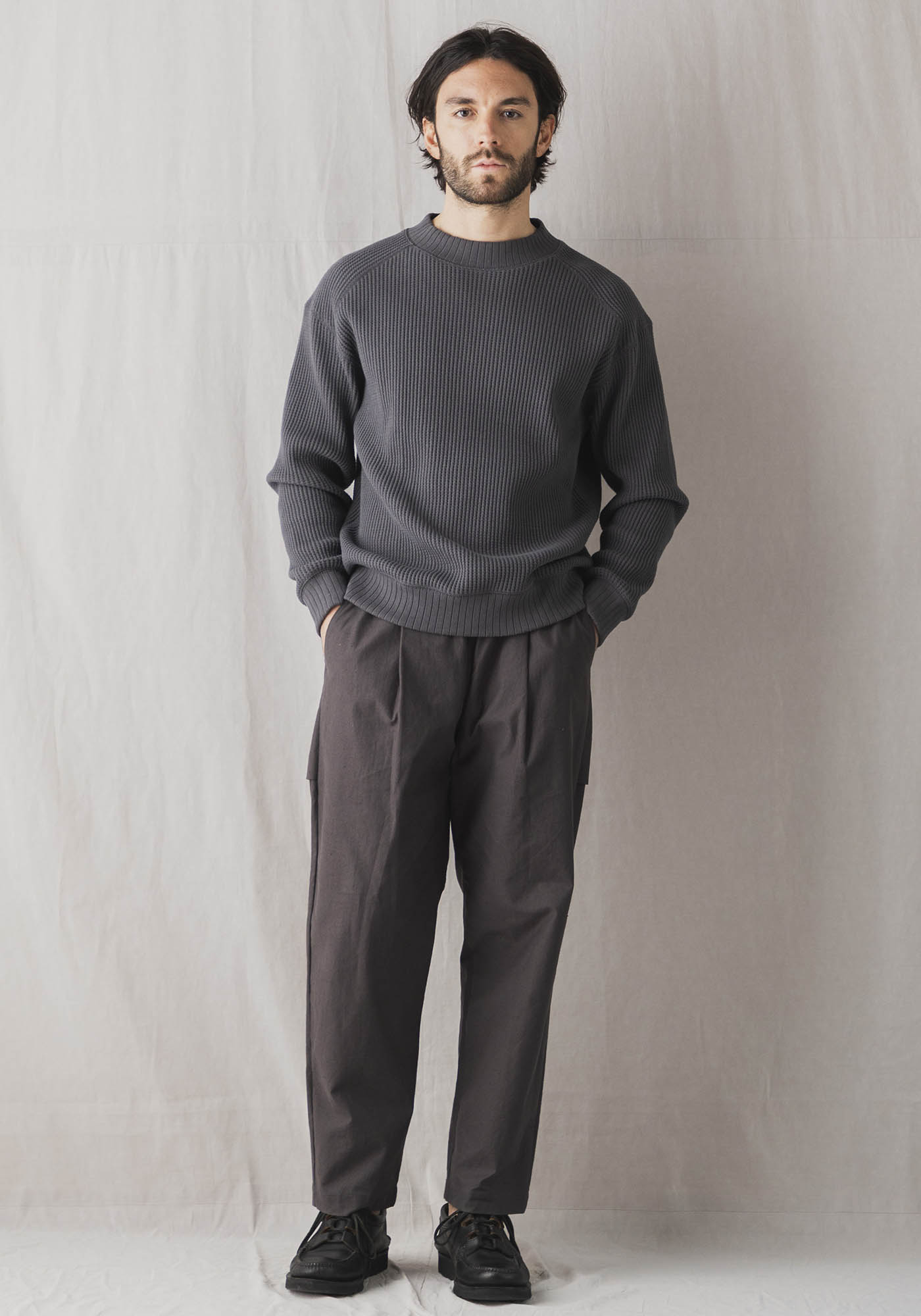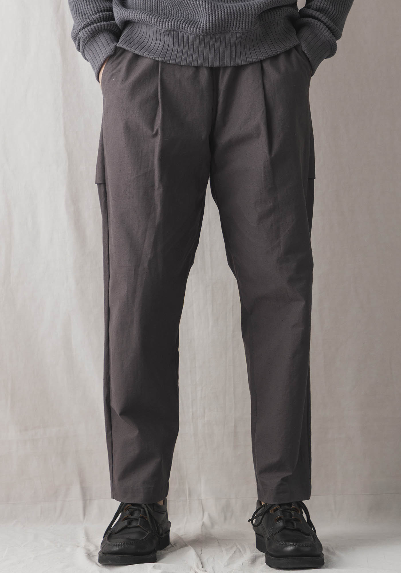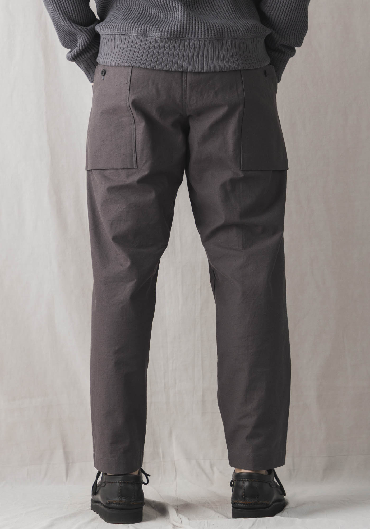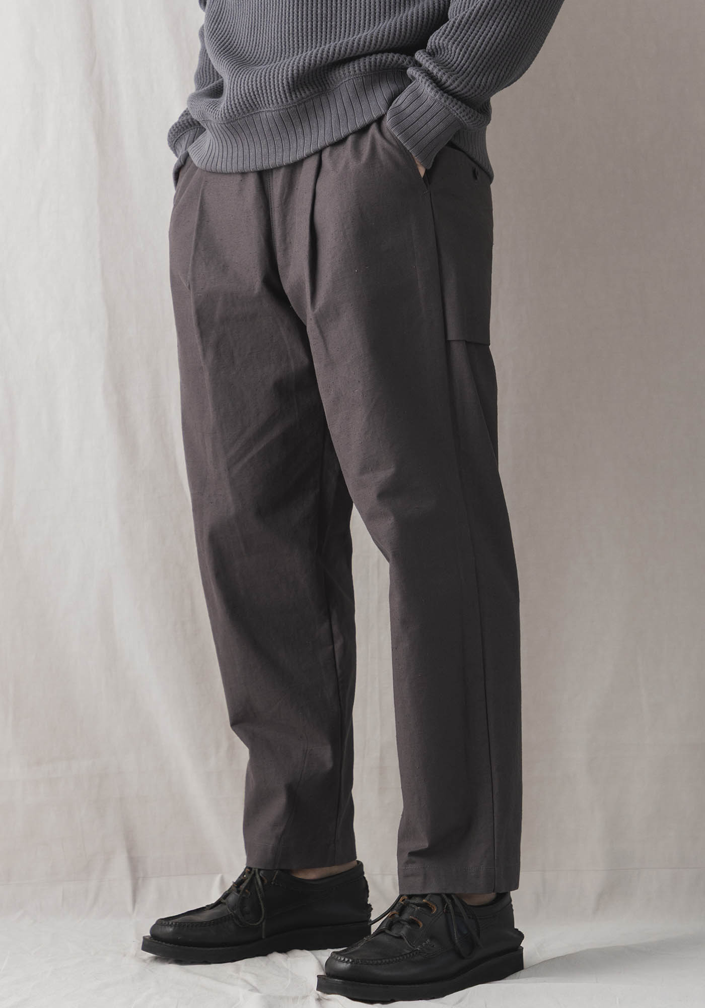 乾燥感のあるアメリカ、オーストラリアの混合綿を使用、その原綿をカーディングする際、機械の調整でネップを作り、レピア織機で糸に強度を加えながら織ることで生地自体の強度を高めたバックネップ素材を使用したBNアンプスパンツです。このバックネップ素材は表面に上品さを出すためシルケット加工をせず染色、ネップの凹凸を残しながら自然で上品な表情に仕上げました。またハリコシを出すために樹脂で硬仕上げを施し防風性の向上と洗濯による形状変化を抑える加工を加えました。デザインはBaseballの球審の腰回りのシルエットを参考にスペアボールを入れていたような大きめのマチ付きポケットを配しました。腰回りはゆったりとしながらも裾にかけて強めのテーパーですっきり見える設計です。ウエストはゴムとコードで調節が可能です。