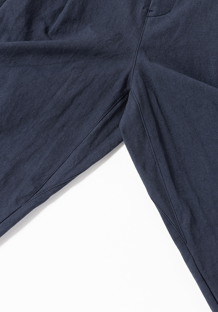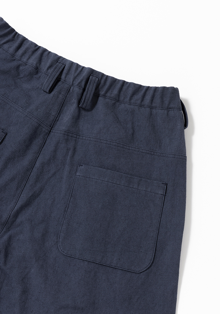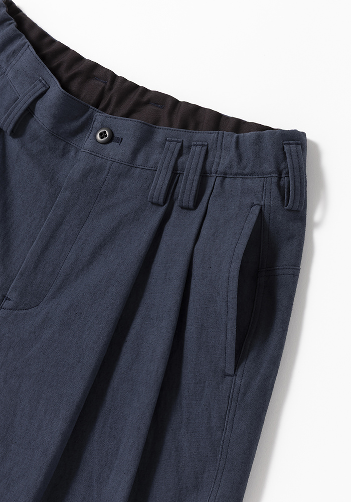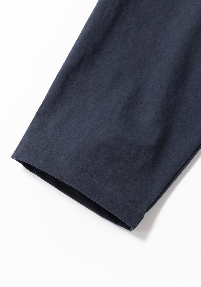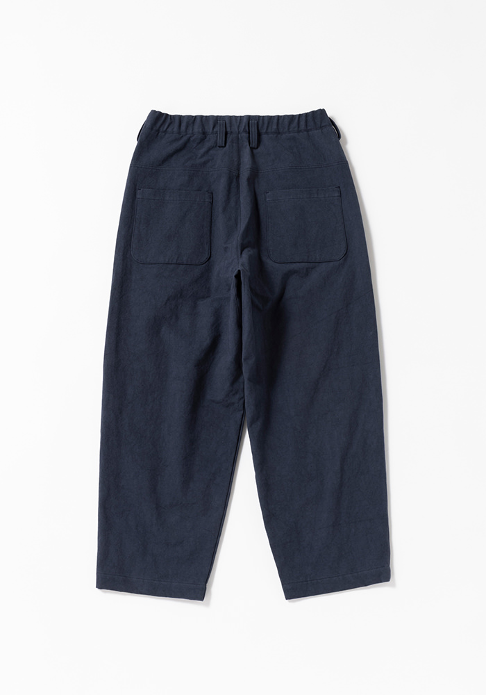 2013年リリースのルーキーパンツで使用している硫化染めのキャンバス織り布帛を使用したキャンバストラウザーです。硫化染めは通常の染色方法とは違い意図的にシワや色ムラ、スジを作るようにして染めるので粗野な素材がさらに無骨に見えます。デザインはヒップから太もも部分にはゆとりをもたせひざから裾にかけてテーパーをかけました。ウエストはゴムシャーリングとBaseballユニフォーム特有の左前2本ベルトループ、前開き仕様でクラシカルな2タック。穿き心地が良くゆとりのあるシルエットです。まだ寒さの残る2-3月のセットアップとしてリリースします。(ジャケットJM8612)販売予定日2月