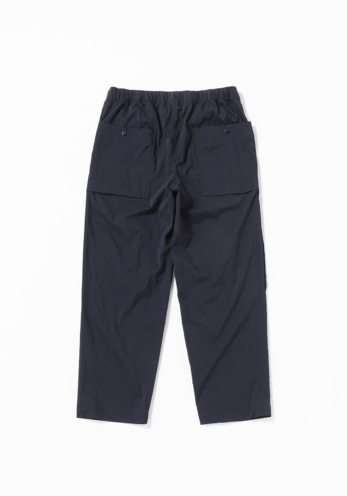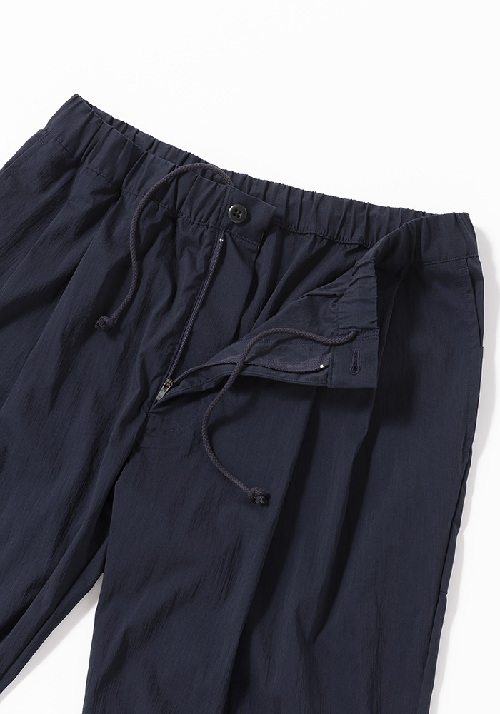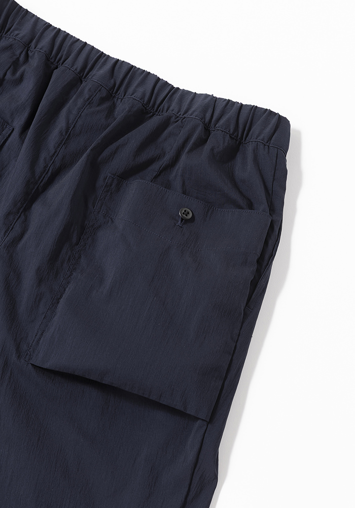 コットンナイロンクレープは経糸には80/1の極細コットン、緯糸にはナイロンとポリウレタンの加工糸を使用して織り立てた素材です。綿と化繊の収縮率の違いを利用してちりめん状のシワを作り肌への接地面を減らしていますのでサラッとした肌触りです。素材自体も軽くて薄く、蒸れにくくストレッチ性と速乾性に優れていますので夏でも快適に着用できます。デザインはBaseballアンパイヤの腰回りシルエットを参考にスペアボールを入れていたような大きめのマチ付きポケットを配し、2タック仕様で後ろよりも前面にゆとりをもたせました。販売予定日3月