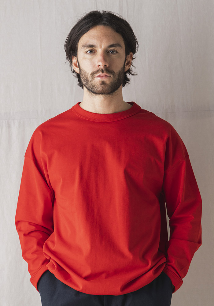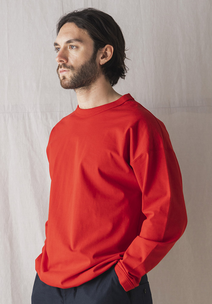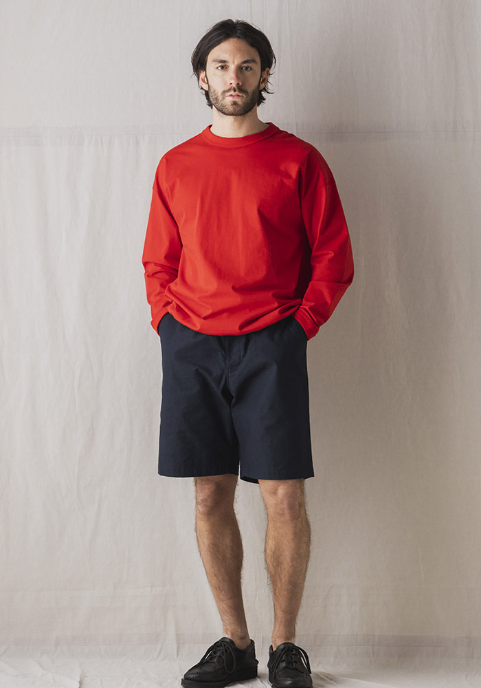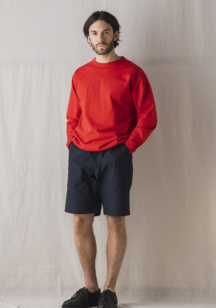 綿の表面の毛羽を特殊な技術で溶かしてしっとりと滑らかな肌触りを実現したグレース天竺。毛羽を除去したことで接触冷感や防汚といった夏に嬉しい機能も付加、耐久性も高い素材です。グレース天竺は適度な肉厚感があるので肌が透ける度合いも少なく、肉厚なのに重さがないので夏の暑い季節でも着用できる独特な素材です。主な縫製は裏側の縫い代がごろつかないフラットシーマ。裾のヒモを絞ることで色々なニュアンスが楽しめる裾紐仕様はバッティングゲージで打ち込む選手が着用する、裾にアジャスターが付いた練習用シャツを参考にしました。紐を絞ることで生地と肌の間に隙間が生まれ肌にまとわりつかず快適に着用できます。