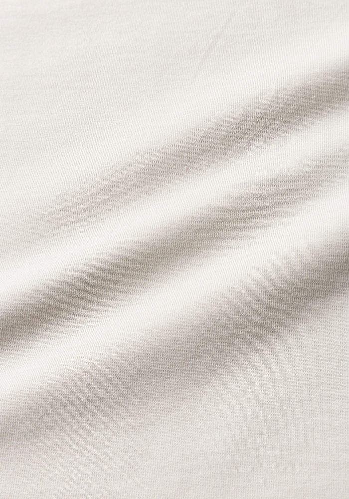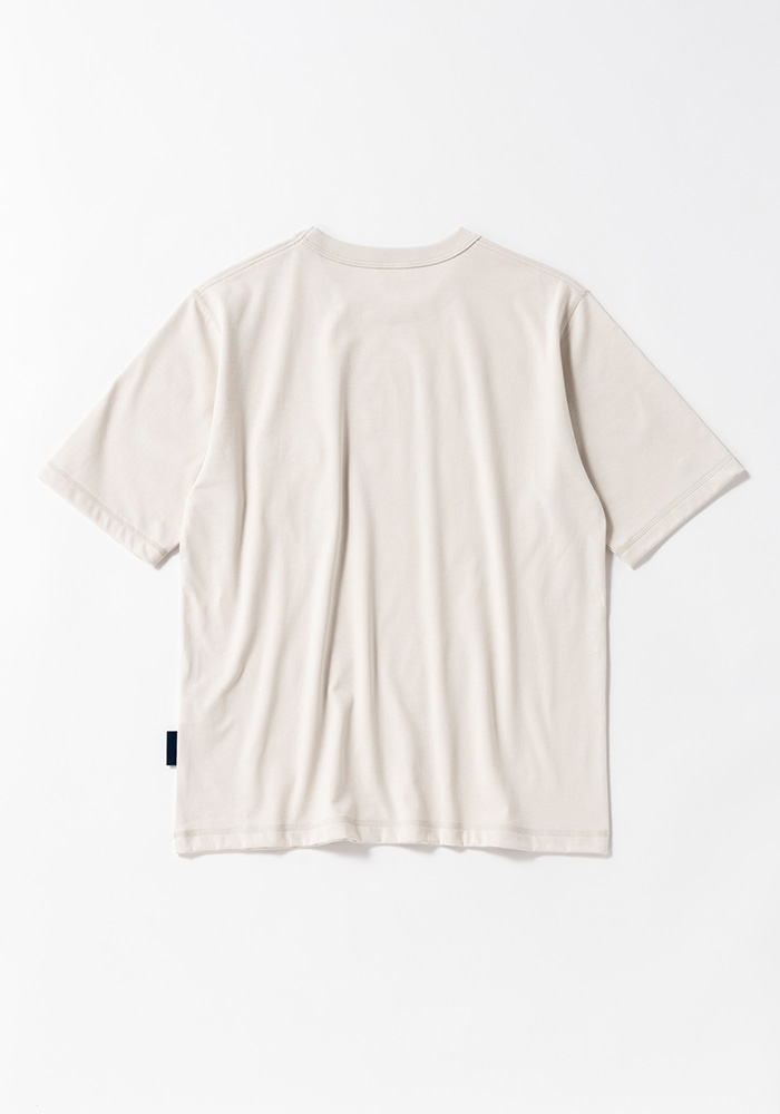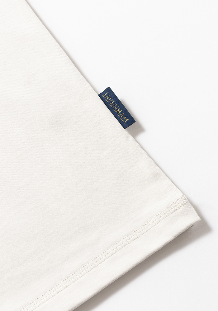 2026年春の英国ラベンハムコラボレーションTシャツです。 綿の表面の毛羽を特殊な技術で溶かしてしっとりと滑らかな肌触りを実現したグレース天竺。毛羽を除去したことで接触冷感や防汚といった夏に嬉しい機能も付加、耐久性も高い素材です。グレース天竺は適度な肉厚感があるので肌が透ける度合いも少なく、肉厚なのに重さがないので夏の暑い季節でも着用できる独特な素材です。主な縫製は裏側の縫い代がごろつかないフラットシーマ、脇部分は2本針で縫製しています。ポケットは英国サフォークのラベンハム自社工場で製造した綿100%1インチスラントダイヤキルトを採用。キルティング素材ですが中綿を抜き軽さを出しました。1900年初頭のBaseballユニフォームに採用されていたポケットを参考にマチ付きスクエアポケットを配しました。春から暑さの残る秋まで長い期間の着用が可能なTシャツです。