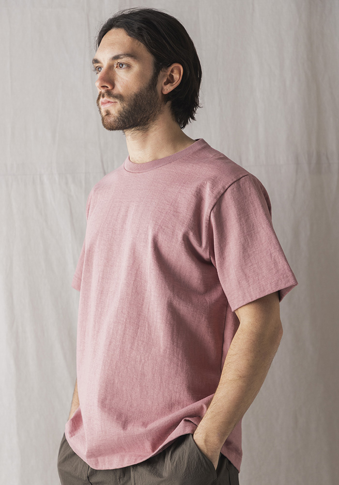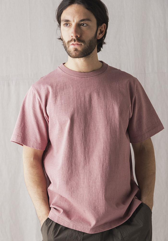 米綿を吊り編み機で限界まで度目を詰めて編み立てた約11.5オンスの極厚素材「ドツメ天竺」を使用した半袖Tシャツです。自動制御のシンカー機では再現できない職人のコントロールが必要な吊り編み機ならではの限界まで度目が詰まった生地は着用と洗濯を繰り返しても縮みやゆがみが起こりにくいのが特長です。透けない、汗染みが目立ちにくいといった見栄えの安心感があり、ハリ感もあるので肌へのまとわりつきも少なく良い着心地です。身生地に合わせスウエット並みのしっかりした厚みのリブを使用。首周りの補強のために肩から首の後ろにかけてクラシカルなアメリカンラッパ仕様、袖口と裾はほつれを防止するカン止めを打っています。