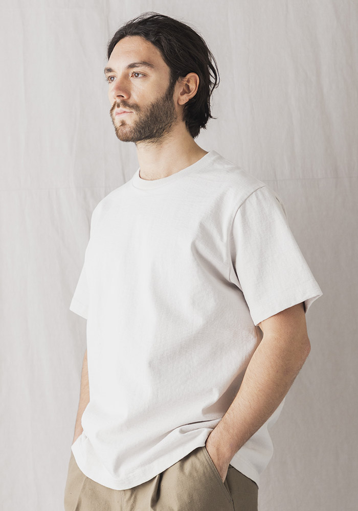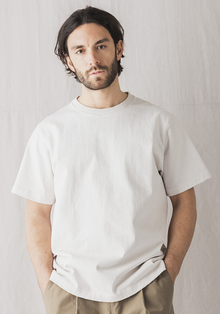 米綿を吊り編み機で限界まで度目を詰めて編み立てた約11.5オンスの極厚素材「ドツメ天竺」を使用した半袖Tシャツです。自動制御のシンカー機では再現できない職人のコントロールが必要な吊り編み機ならではの限界まで度目が詰まった生地は着用と洗濯を繰り返しても縮みやゆがみが起こりにくいのが特長です。透けない、汗染みが目立ちにくいといった見栄えの安心感があり、ハリ感もあるので肌へのまとわりつきも少なく良い着心地です。身生地に合わせスウエット並みのしっかりした厚みのリブを使用。首周りの補強のために肩から首の後ろにかけてクラシカルなアメリカンラッパ仕様、袖口と裾はほつれを防止するカン止めを打っています。