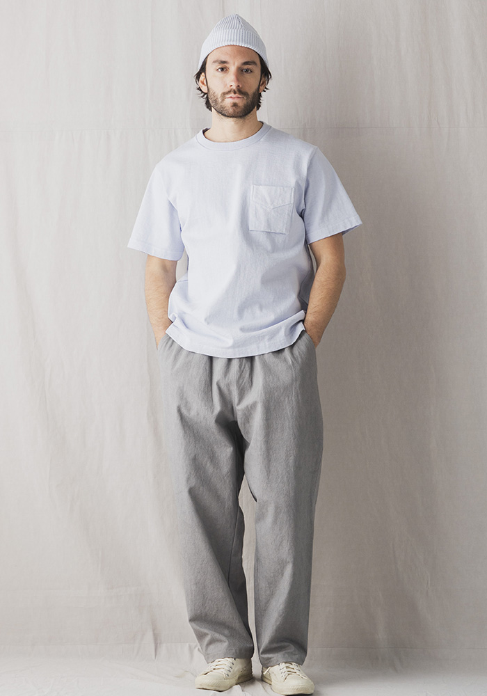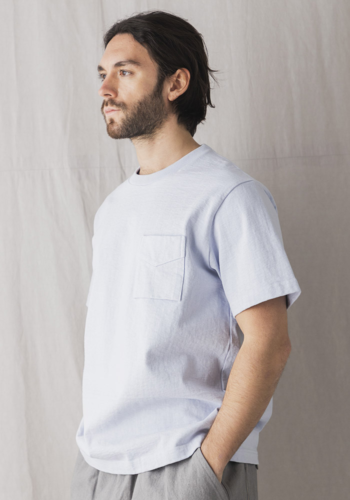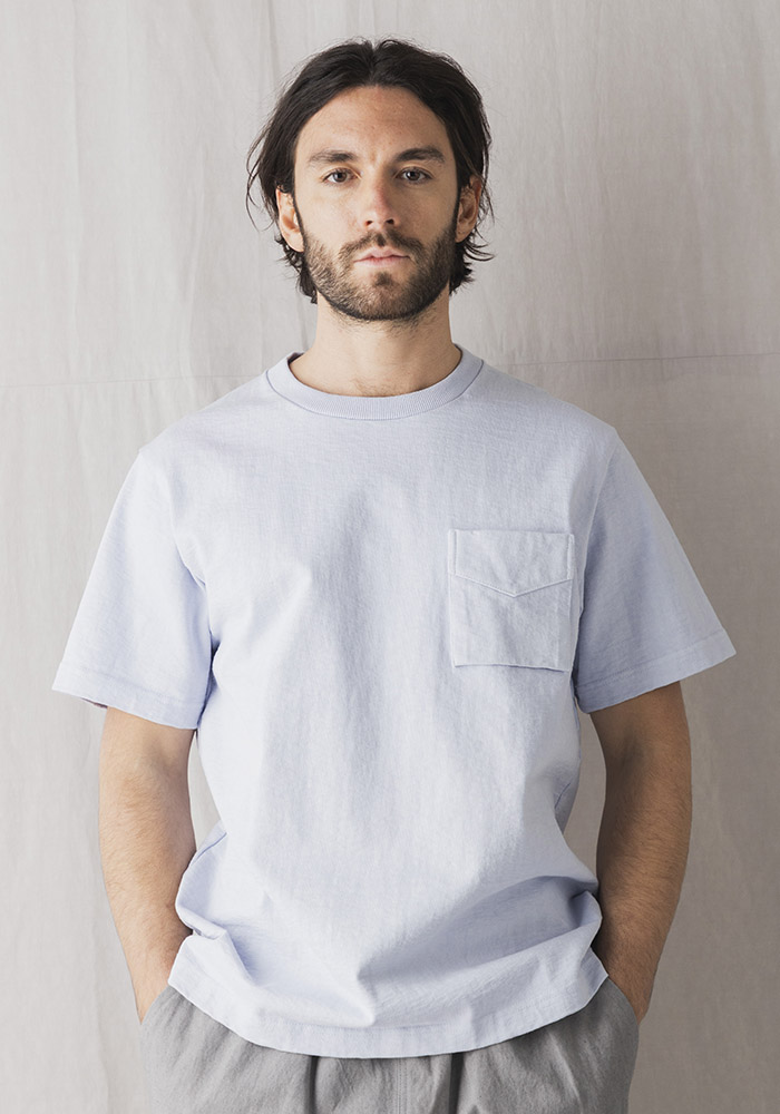 米綿を吊り編み機で限界まで度目を詰めて編み立てた約11.5オンスの極厚素材「ドツメ天竺」を使用した半袖Tシャツです。自動制御のシンカー機では再現できない職人のコントロールが必要な吊り編み機ならではの限界まで度目が詰まった生地は着用と洗濯を繰り返しても縮みやゆがみが起こりにくいのが特長です。透けない、汗染みが目立ちにくいといった見栄えの安心感があり、ハリ感もあるので肌へのまとわりつきも少なく良い着心地です。身生地に合わせスウエット並みのしっかりした厚みのリブを使用。首周りの補強のために肩から首の後ろにかけてクラシカルなアメリカンラッパ仕様、袖口と裾はほつれを防止するカン止めを打っています。左胸のポケットは1900年初頭のBaseballユニフォームに見られるふらし付きのホームベース型見返し仕様です。