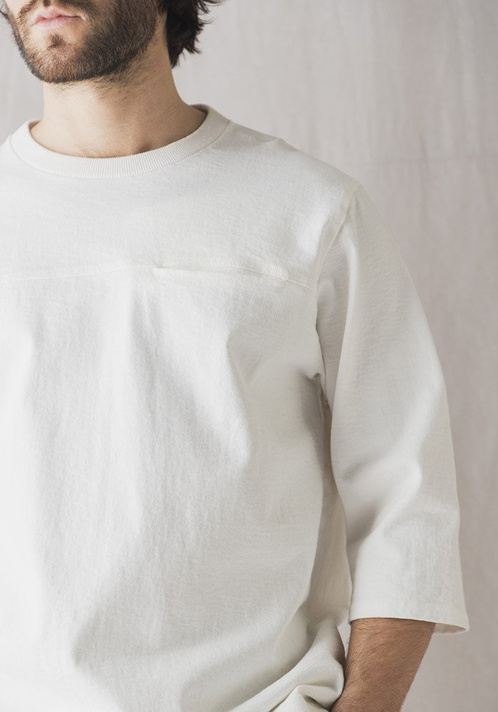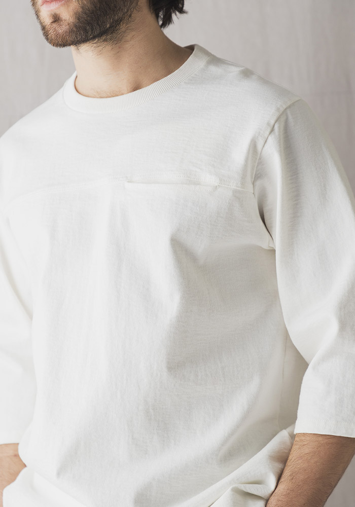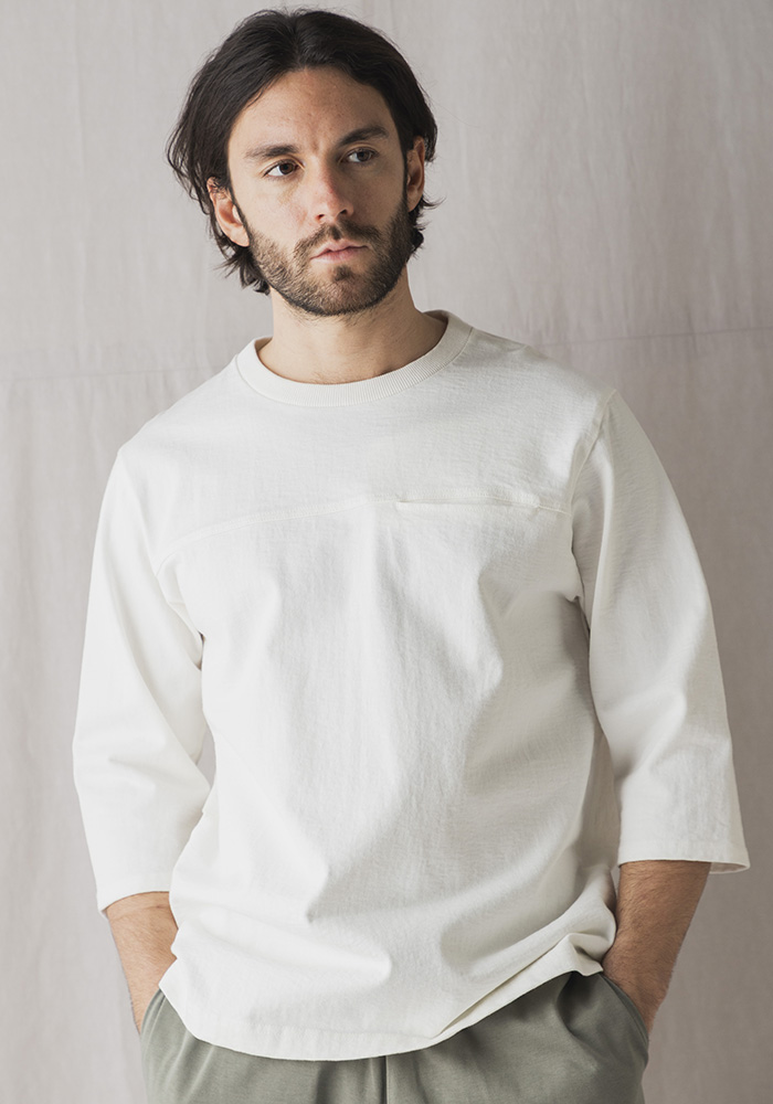 アメリカ産のコットンを使用して吊り編み機で限界まで度目を詰めて編み立てた約11.5オンスの極厚素材「ドツメ天竺」を使用したハーフスリーブTシャツです。均等に極限まで度目を詰めたドツメ天竺生地は着用と洗濯を繰り返しても縮みやゆがみが起こりにくいのが特長です。身生地に合わせスウエット並みのしっかりした厚みのリブを使用し全体のバランスを整えました。透けない、汗染みが目立ちにくいといった見栄えの安心感があるTシャツです。身巾や着丈はドツメ半袖T‐Shirt(JM5444、5445)と同じですが袖丈は半袖に比べて約18㎝長いクラシカルなアンダーシャツのような雰囲気です。胸の切替部分には熟練の技術でシームポケットを収まり良く配しました。