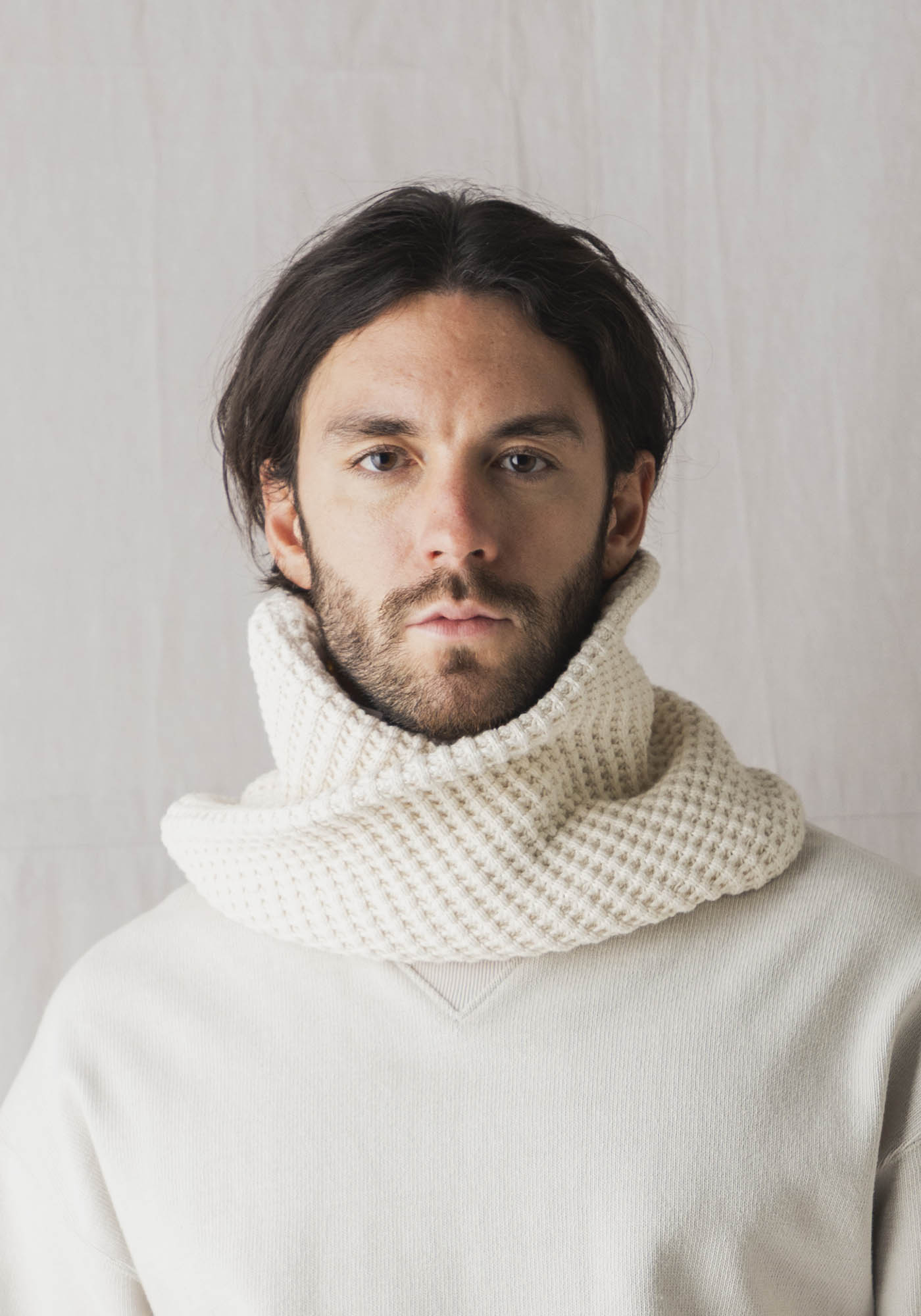 希少な5ゲージのジャカード編み機を使い甘く撚った綿糸を引き揃えてワッフル編みしたビッグビッグワッフル素材のスヌードです。主にウールの編み立てで使用される5ゲージの編み機は綿で使用すると重くなりすぎるため通常は使用しませんが、ビッグビッグワッフルは甘撚りしたことで軽量化に成功。糸も太い為、ふわっとしたバルキー感も出て温かみのある表情になりました。このスヌードはBaseball選手の着用も見受けられる筒状のネックウォーマーの一種で半ねじりのループ状になっていますので立体感のあるスタイリングが可能です。