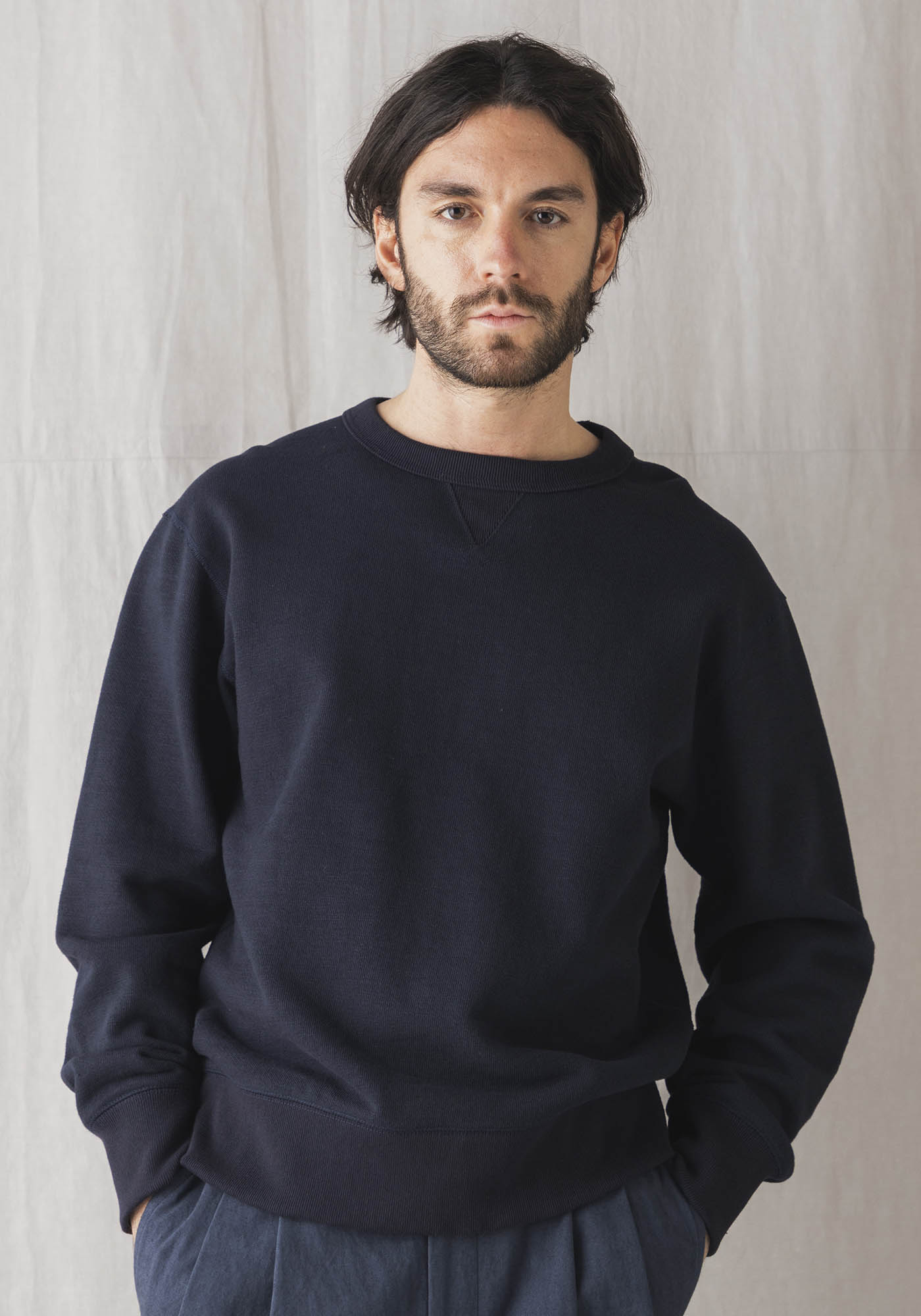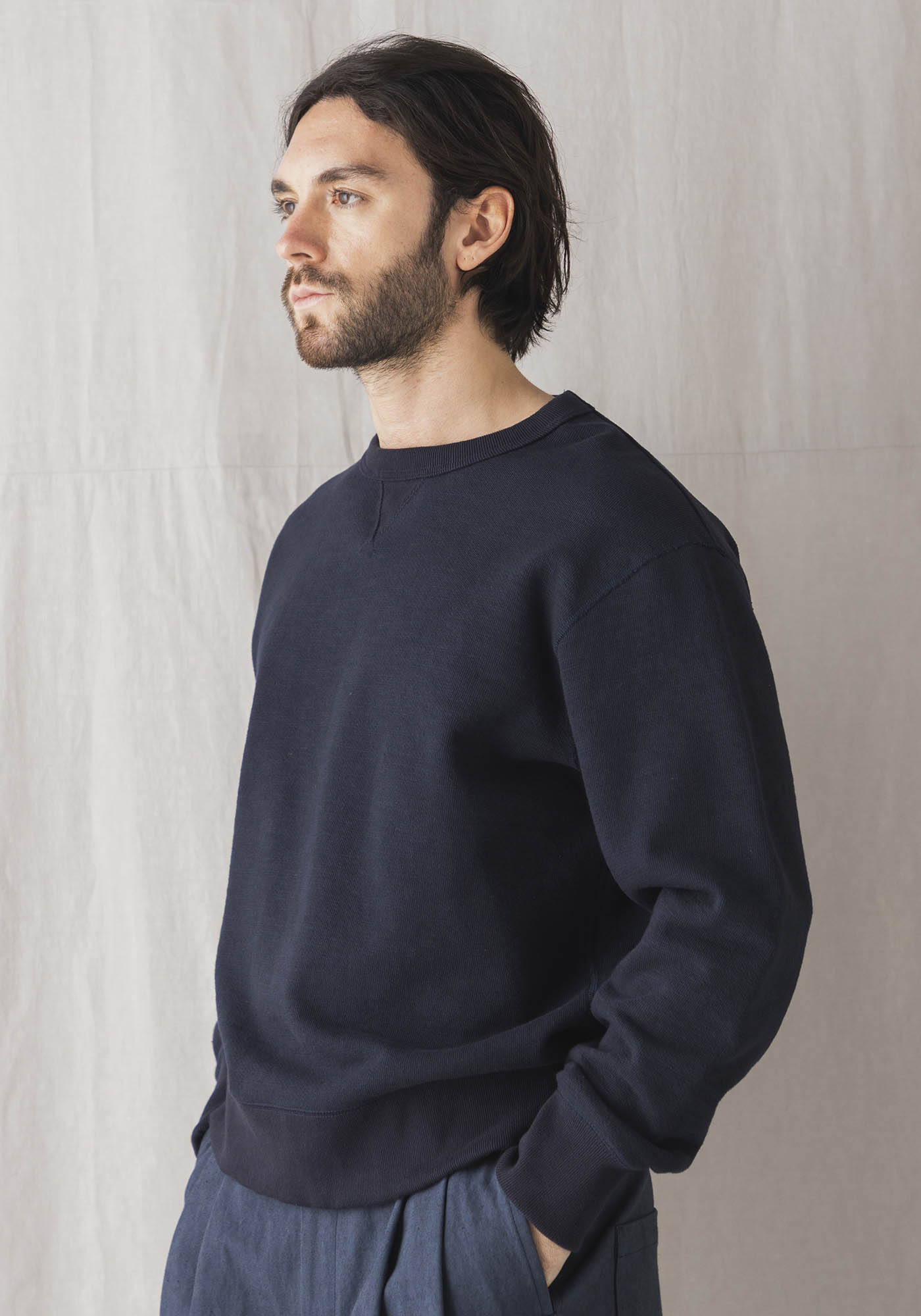 肉厚感のあるスウェット素材「GG裏毛」を使用したクルーネックシャツです。首元、袖口、裾に配したリブも身頃の肉厚感とのバランスを考え2本取りして編み立てることで耐久性を高めました。着用時の快適さを追究した結果、肌に触れる主要部分の縫製は縫い代が平らになり、ごろつき感が少ないフラットシーマを採用。首元のガセット(マチ)は前後に配置して着脱時の伸縮を補助、首のリブが伸び切るのを防止します。設計はオーバーサイズに見えないように工夫しながら首周りと袖にゆとりをもたせ窮屈に感じない着用感にしました。頑丈で着込むほどに愛着が湧くスウェットシャツです。