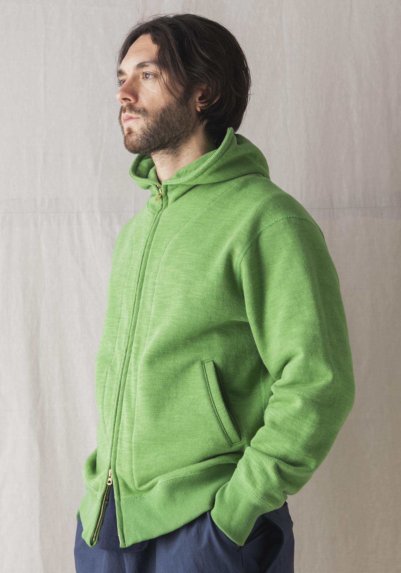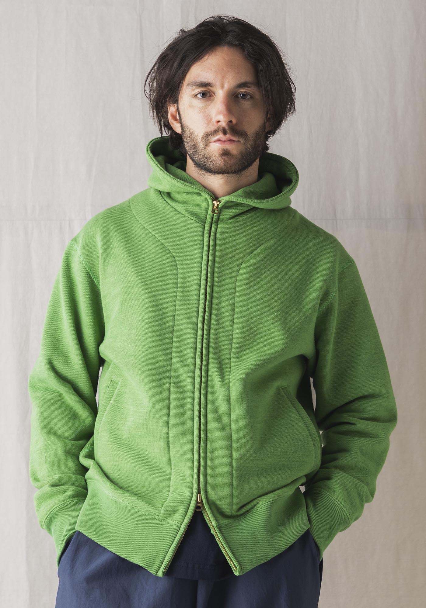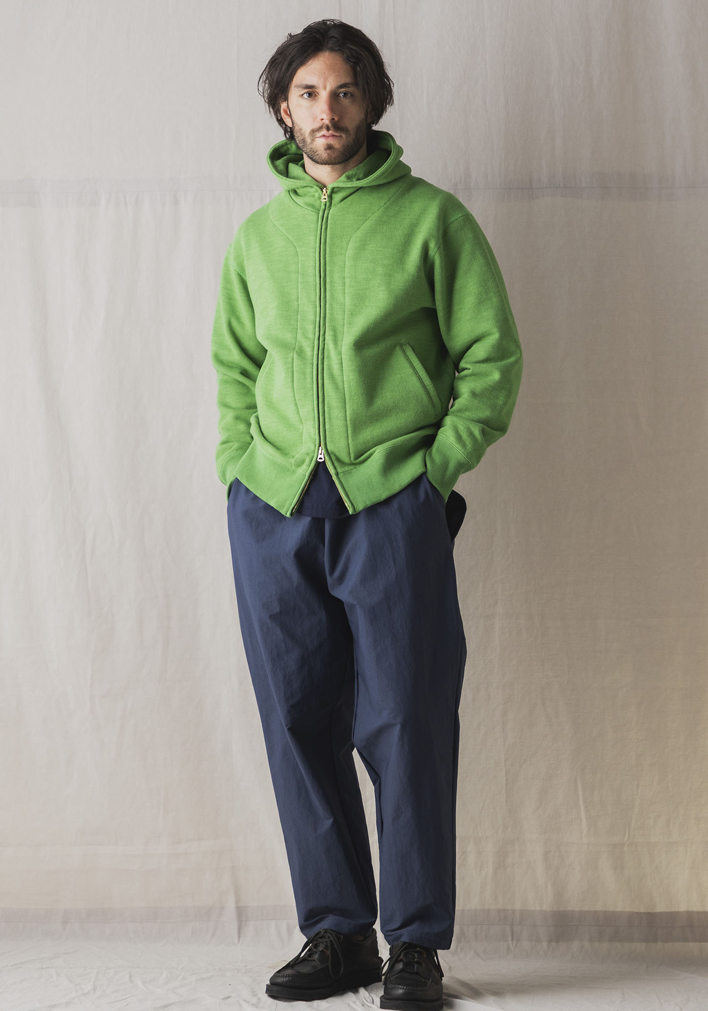 着用時の上品さを追究してマイナーチェンジしたスウェットジップパーカです。素材は2014年から継続展開しています太番手の国産糸を使用し日本国内で編み立てた肉厚なGG(ガラガラ)裏毛。縫製は着用時の快適さを追究し肌に触れる主要部分は縫い代が平らになり、ごろつき感が少ないフラットシーマを採用。デザインはラフに見えがちなスピンドルを排除、フード先を立ち上げるファスナー仕様に変更して紐で絞らなくても首元に侵入する寒さを防止し保温性を高めます。また首元まで伸びたファスナーが肌や衣服を傷つけないように両面務歯隠し仕様にしました。ファスナーを開けて着用した際も上品なシルエットに見えるようにBaseballユニフォームのような見返し補強を首周りに採用、JackmanのDNAと上品さを融合した新しいGG Sweat Parkaです。