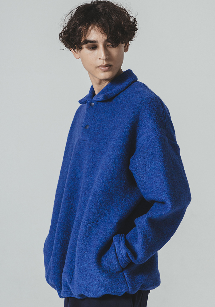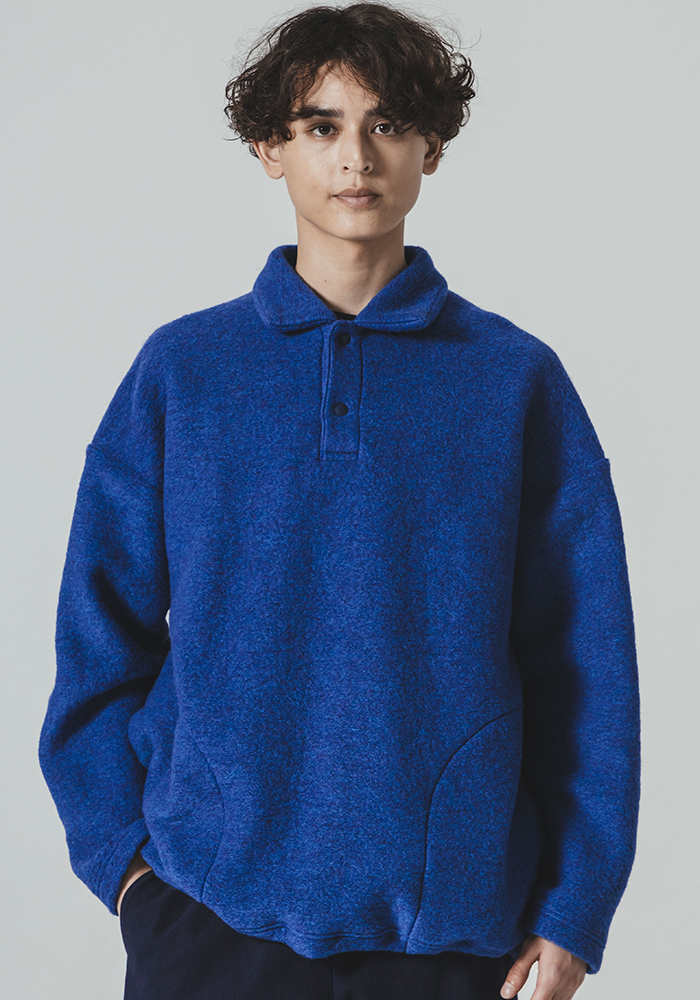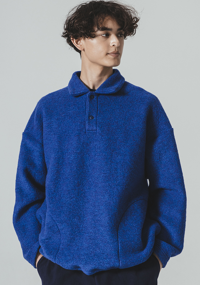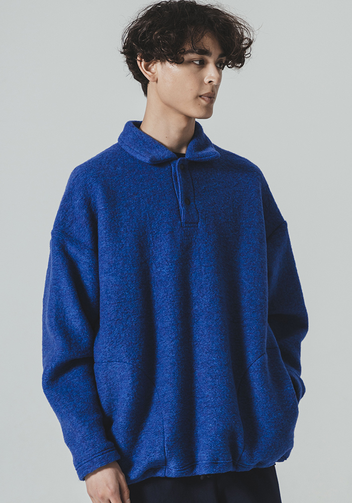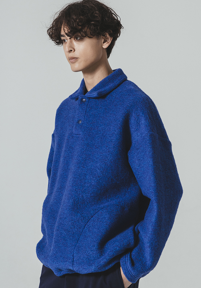 スコットランド北部のシェットランド諸島特有の太くて柔らかい毛質のウールを原料にイタリアでスライバー編み機を使用してジャージ編みした素材を使用したヒモポロです。スライバー編み機を使用しウールを撚糸せずかさ高に編み上げますので温かい空気を繊維の中にとどまらせ高い保温性を発揮します。デザインは従来ウールダブルフェイスで展開していたヒモポロシャツをベースにヒモを絞ったときの着丈をベストな長さにするため+4㎝の設定にしました。ラフに着用するアウターのイメージから立ちやすい襟やプランサードットボタンを採用、サイドにはシームポケットを配しました。