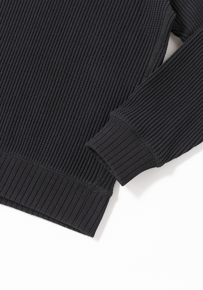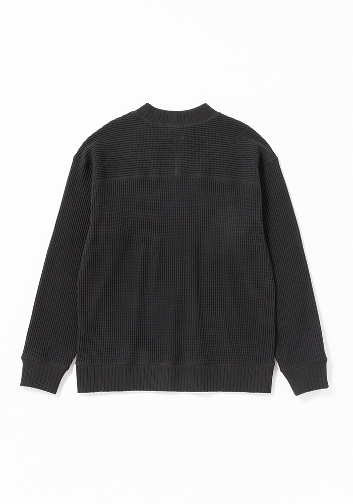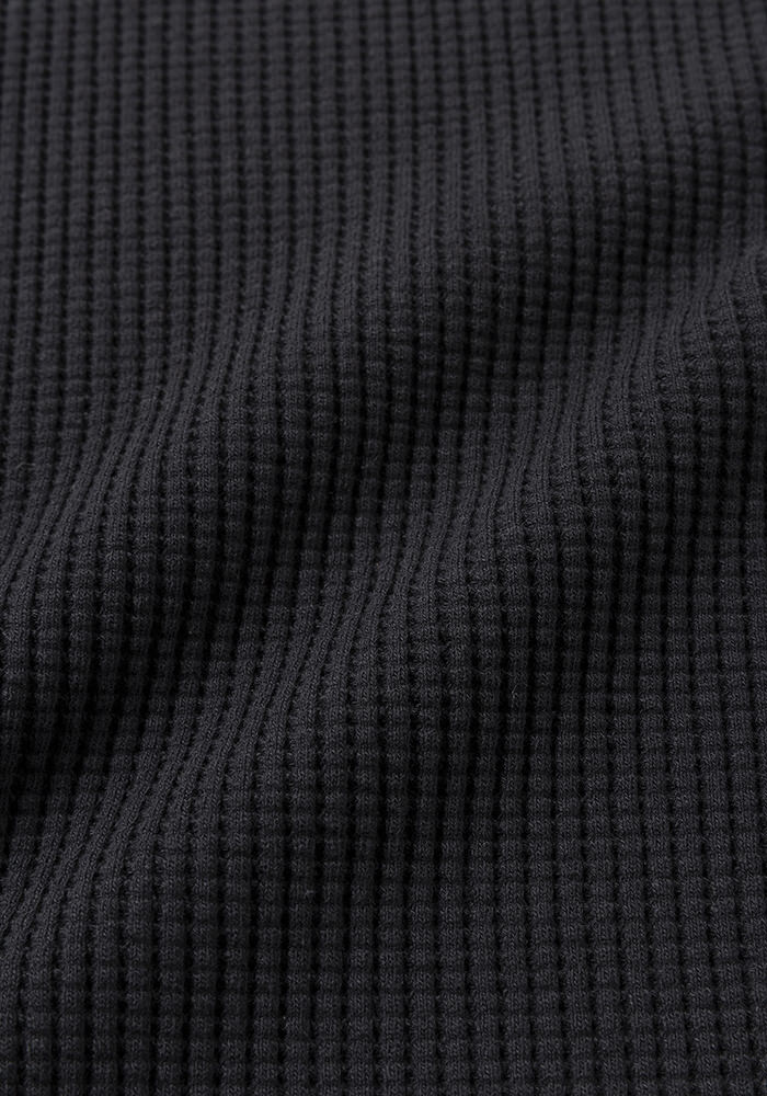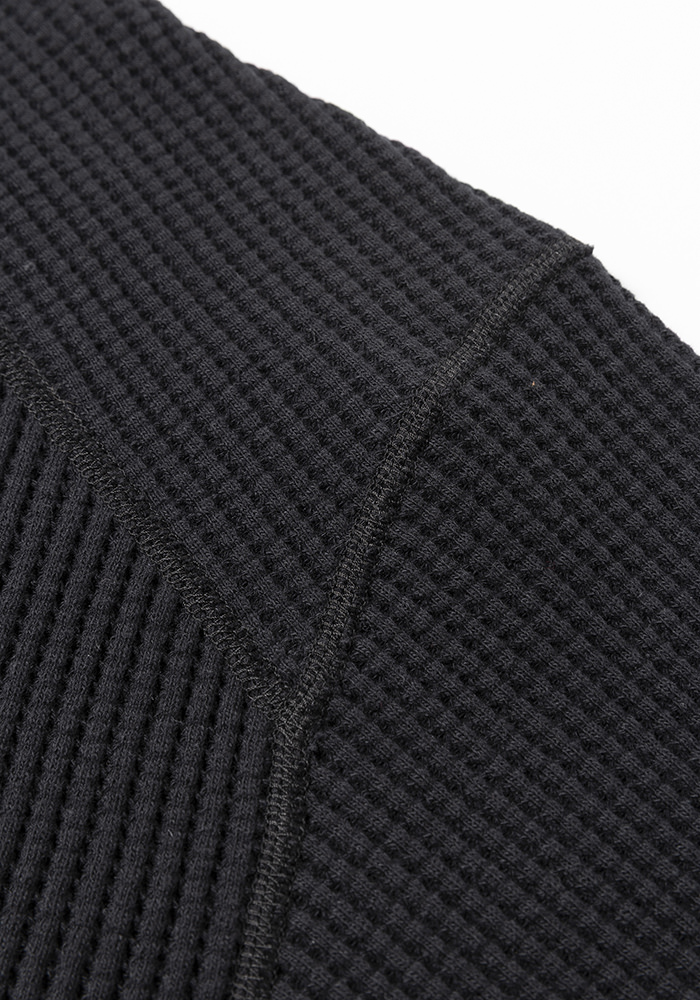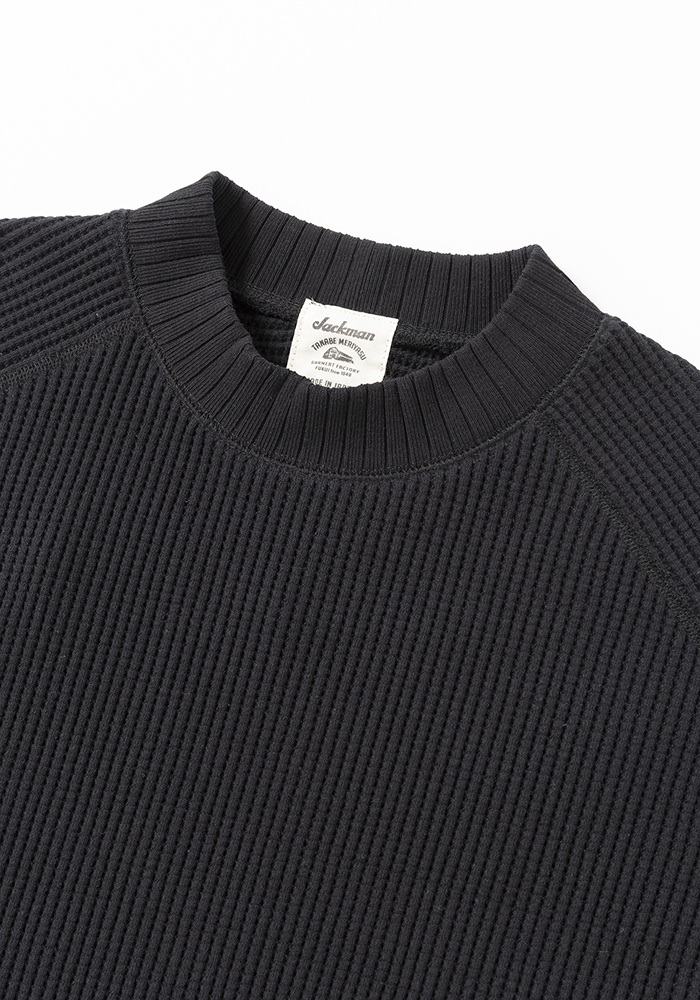 ワッフルミッドネックのリニューアルモデル。2016年の開発当初は首元、袖口,裾に極太リブを使用して、見映えの良い、温かいサーマル組織のインナーをテーマにリリースしたワッフルミッドネックですが、10年のときが経ち秋の気温や着用の変化を考え1枚で着用することを基本に設計を見直しました。大きな変更点は身巾+6㎝、着丈+2㎝に寸法を修正、肩周りにもゆとりをもたせたパターンにしました。素材は今まで同様綿100%ビッグワッフル。温かみがあり耐久性も兼ね備えた素材です。着用と洗濯による伸び、縮みを防止するためにロール状になった原反を一度ほどいて24時間放置。生地を自然な状態に戻して負荷がかかっていた部分をフラットな状態に戻すことで洗濯後の型崩れや縮みを軽減します。主要部分の縫製は縫い代がごろつかないフラットシーマ。着用時の肌面へのストレスが少なく直接肌に触れる部分も快適です。首元、袖口、裾は軽さがあり硬めの針抜きリブを使用していますので洗濯時の伸びや縮みもほぼありません。デザインはクラシカルな防寒用Baseballアンダーシャツを参考に優しい表情のセーターのような雰囲気に仕上げました。