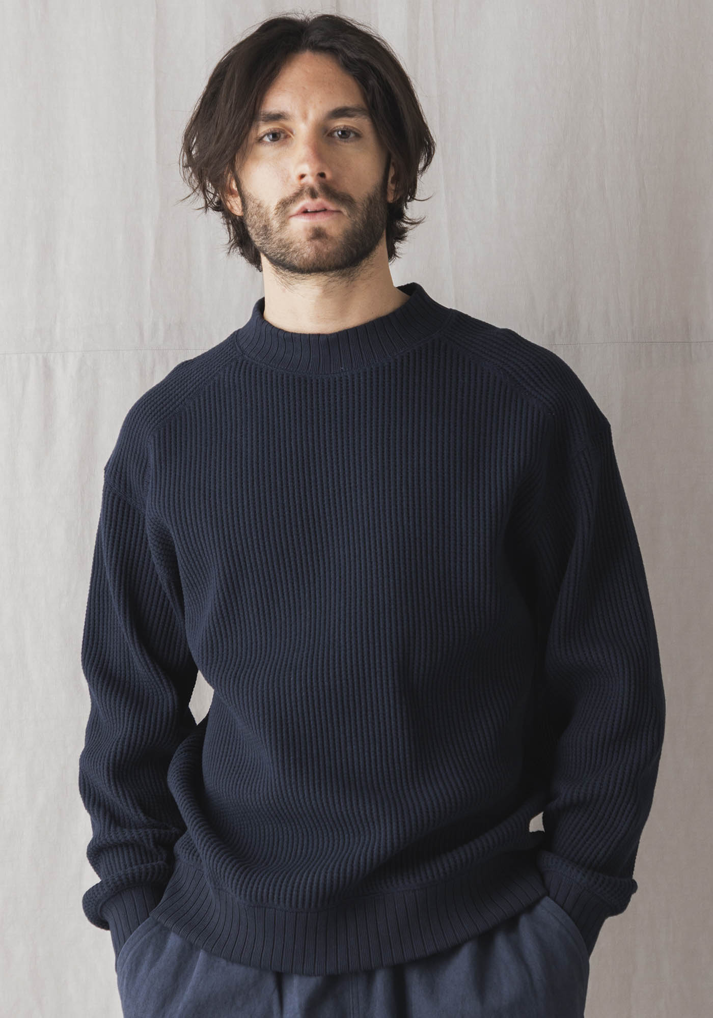 ワッフルミッドネックのリニューアルモデル。2016年の開発当初は首元、袖口,裾に極太リブを使用して、見映えの良い、温かいサーマル組織のインナーをテーマにリリースしたワッフルミッドネックですが、10年のときが経ち秋の気温や着用の変化を考え1枚で着用することを基本に設計を見直しました。大きな変更点は身巾+6㎝、着丈+2㎝に寸法を修正、肩周りにもゆとりをもたせたパターンにしました。素材は今まで同様綿100%ビッグワッフル。温かみがあり耐久性も兼ね備えた素材です。着用と洗濯による伸び、縮みを防止するためにロール状になった原反を一度ほどいて24時間放置。生地を自然な状態に戻して負荷がかかっていた部分をフラットな状態に戻すことで洗濯後の型崩れや縮みを軽減します。主要部分の縫製は縫い代がごろつかないフラットシーマ。着用時の肌面へのストレスが少なく直接肌に触れる部分も快適です。首元、袖口、裾は軽さがあり硬めの針抜きリブを使用していますので洗濯時の伸びや縮みもほぼありません。デザインはクラシカルな防寒用Baseballアンダーシャツを参考に優しい表情のセーターのような雰囲気に仕上げました。
