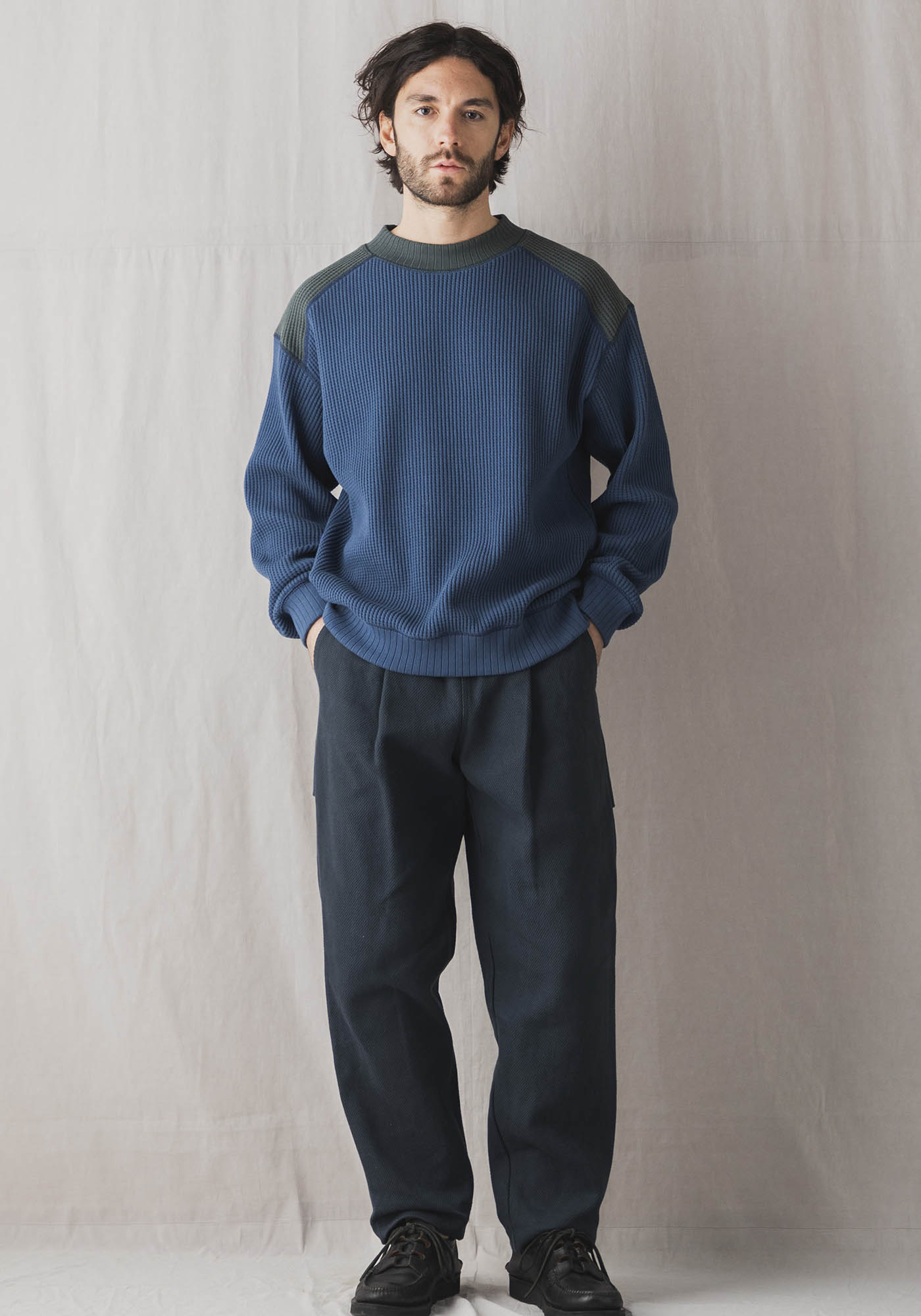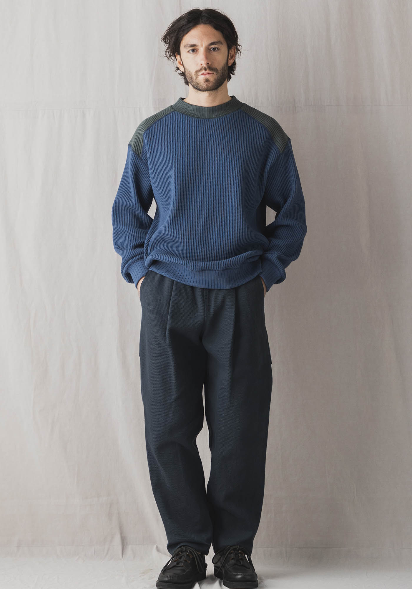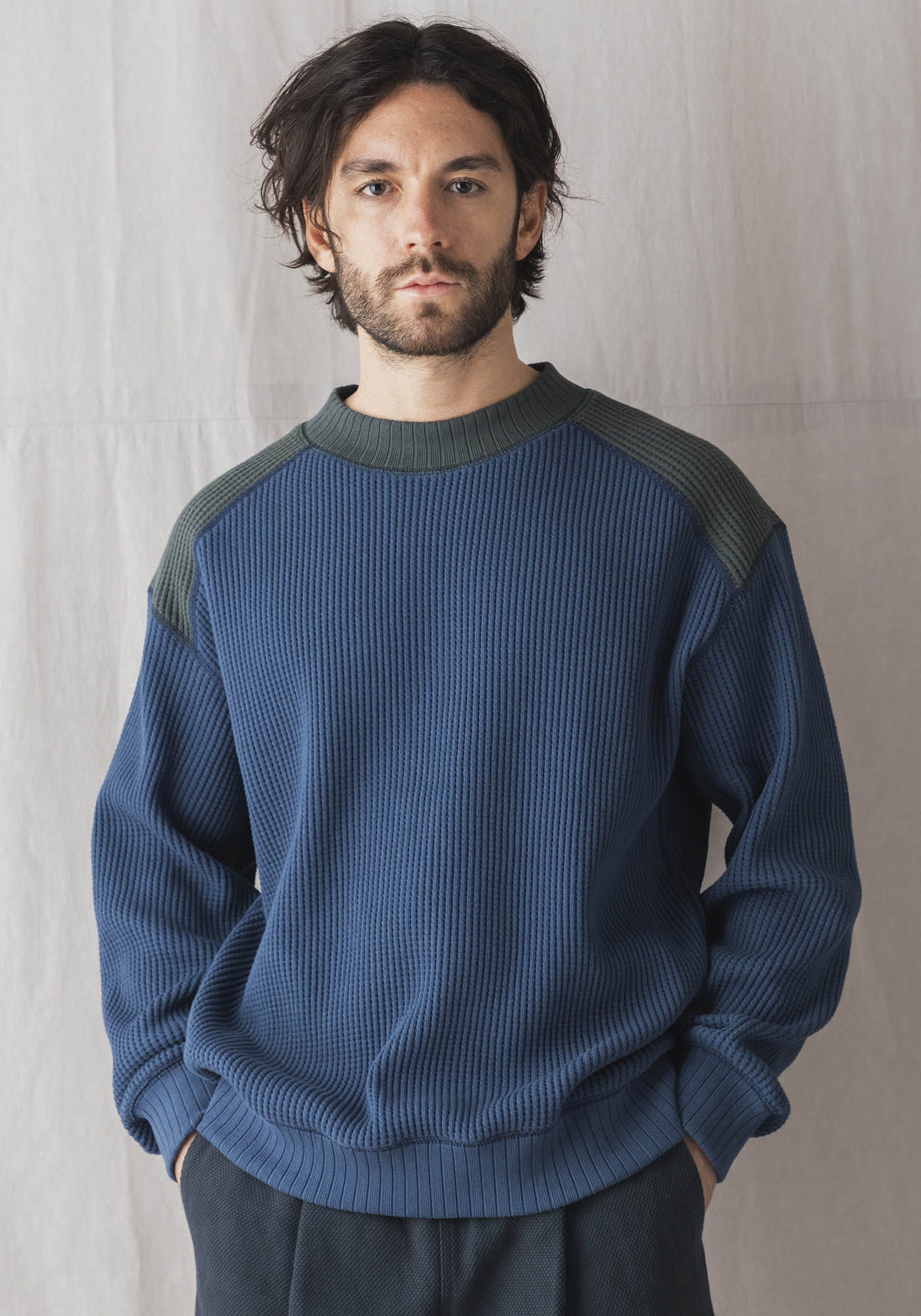 ワッフルミッドネックのリニューアルモデル。2016年の開発当初は首元、袖口,裾に極太リブを使用して、見映えの良い、温かいサーマル組織のインナーをテーマにリリースしたワッフルミッドネックですが、10年のときが経ち秋の気温や着用の変化を考え1枚で着用することを基本に設計を見直しました。大きな変更点は身巾+6㎝、着丈+2㎝に寸法を修正、肩周りにもゆとりをもたせたパターンにしました。素材は今まで同様綿100%ビッグワッフル。温かみがあり耐久性も兼ね備えた素材です。着用と洗濯による伸び、縮みを防止するためにロール状になった原反を一度ほどいて24時間放置。生地を自然な状態に戻して負荷がかかっていた部分をフラットな状態に戻すことで洗濯後の型崩れや縮みを軽減します。主要部分の縫製は縫い代がごろつかないフラットシーマ。着用時の肌面へのストレスが少なく直接肌に触れる部分も快適です。首元、袖口、裾は軽さがあり硬めの針抜きリブを使用していますので洗濯時の伸びや縮みもほぼありません。デザインはクラシカルな防寒用Baseballアンダーシャツを参考に優しい表情のセーターのような雰囲気に仕上げました。