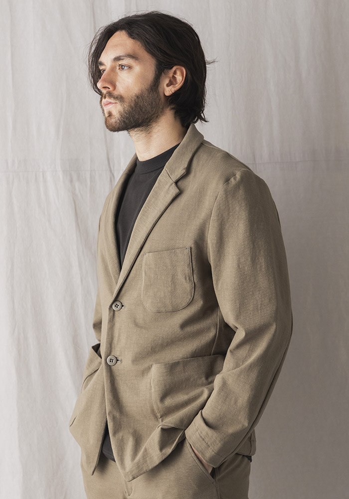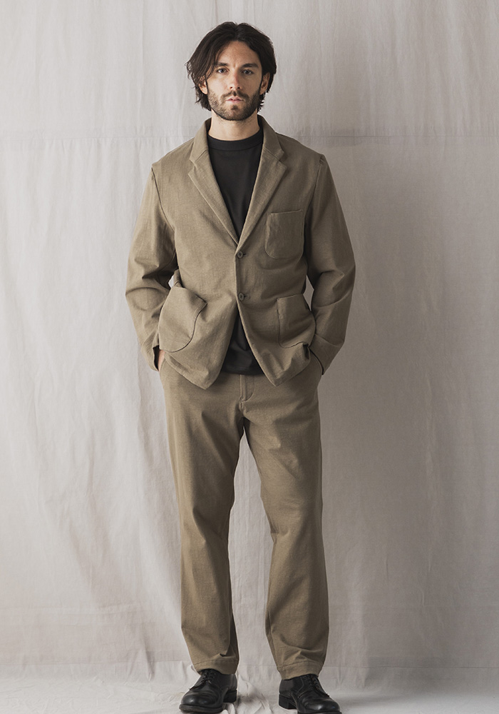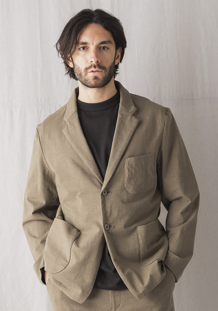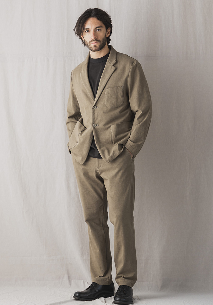 伸縮性の高いポリウレタン糸を綿糸でカバーリングした糸を高密度で編立てた素材を使用したテーラードジャケットです。肌触りは綿特有の柔らかさがありますが、高密度で編み立てることでハリ感が出て季節を問わず着用できます。度目をしっかり詰めることで肘の抜けがほとんどなく型崩れも起きにくいのが特長です。またストレッチ天竺素材は着用時に窮屈感がなく、身体の動きに合わせて適度に伸縮しますので動きやすく、光沢感を抑えることで同素材のトラウザー(JM4955)と組み合わせてビジネスでも着用できます。