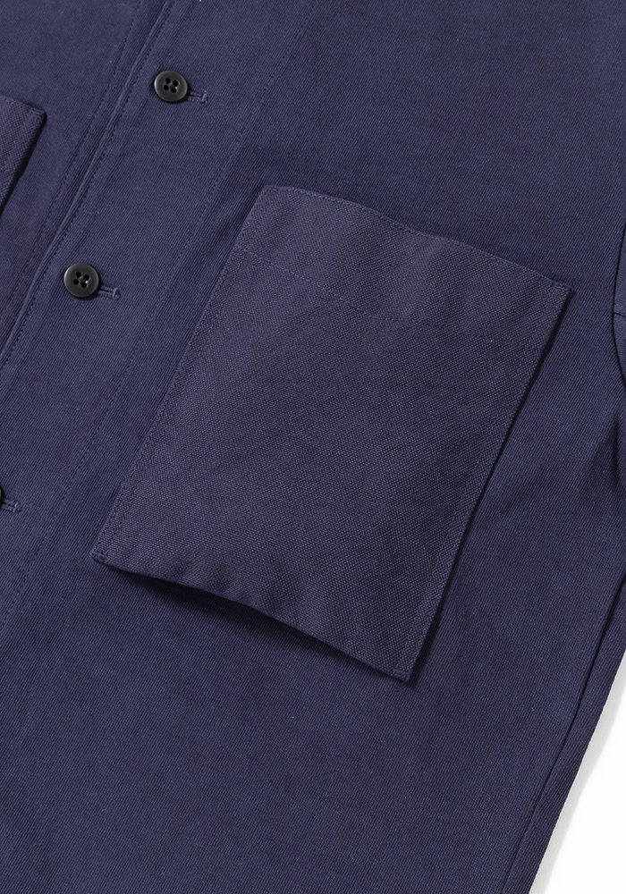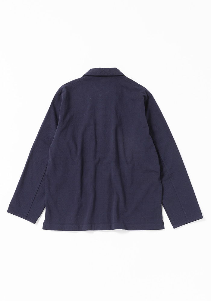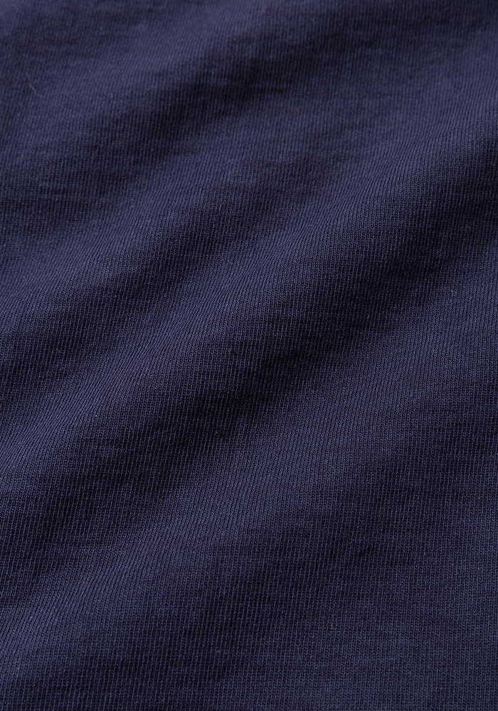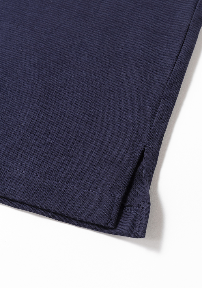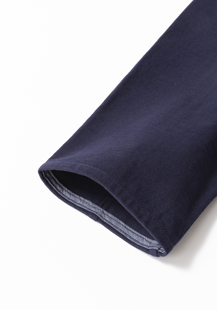 自動制御が効ないアナログな機械「吊り編み機」。シンカー編み機に比べて手間がかかり編み機の台数も限られていますが永く着用できる素材を開発する上で「均一に度目を詰める」必要があったため現在でも変わらず吊り編み機を使用して編み立てています。アメリカ産の綿を使用して編み立てたドツメ天竺は約11.5オンス。均等に度目が詰まっているため着用と洗濯を繰り返しても歪みや型崩れが起きにくい特徴があり、生地に硬さとハリ感があるため着用時も肌離れが良く快適です。そしてこの極厚生地を縫製する自社工場の技術で様々なドツメ天竺のアイテムをリリースしています。このBaseballシャツはまだ襟が付いていた1900年初頭のBaseballユニフォームを参考にカラーごとに異なる素材を衿とポケットに使用。3色とも異なった表情にしました。New color_101 Navy,177 Ink Black,444 Apple Green