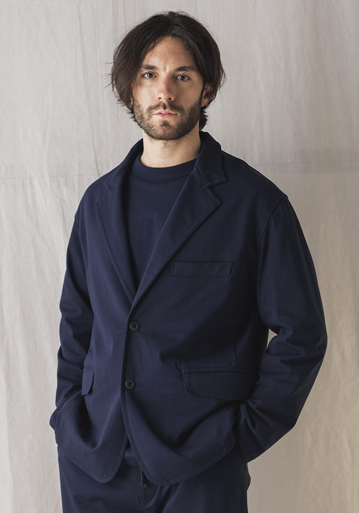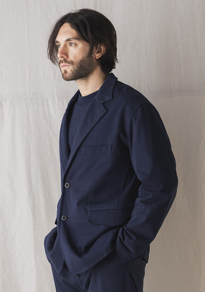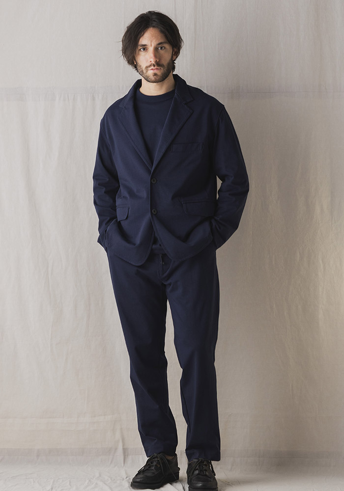 綿の表面の毛羽を特殊な技術で溶かしてしっとりと滑らかな肌触りを実現したグレース天竺。毛羽を除去したことで接触冷感や防汚といった夏に嬉しい機能も付加、耐久性も高い素材です。グレース天竺は適度な肉厚感があるので肌が透ける度合いも少なく、肉厚なのに重さがないので夏の暑い季節でも着用できる独特な素材です。デザインは1930年頃の野球選手やコミッショナーの間で流行ったボリュームのあるラペルと垂れたゴージライン(上襟と下襟の間にある縫い目)が印象的な2ボタンテーラードジャケットがベースで丸みのあるクラシカルなシルエットです。JM4522(グレーストラウザー)とセットアップで着用できます。家庭洗濯が可能ですので夏場も清潔感を保てます。