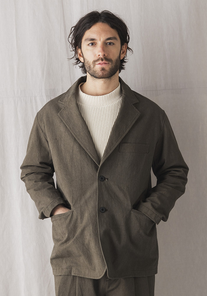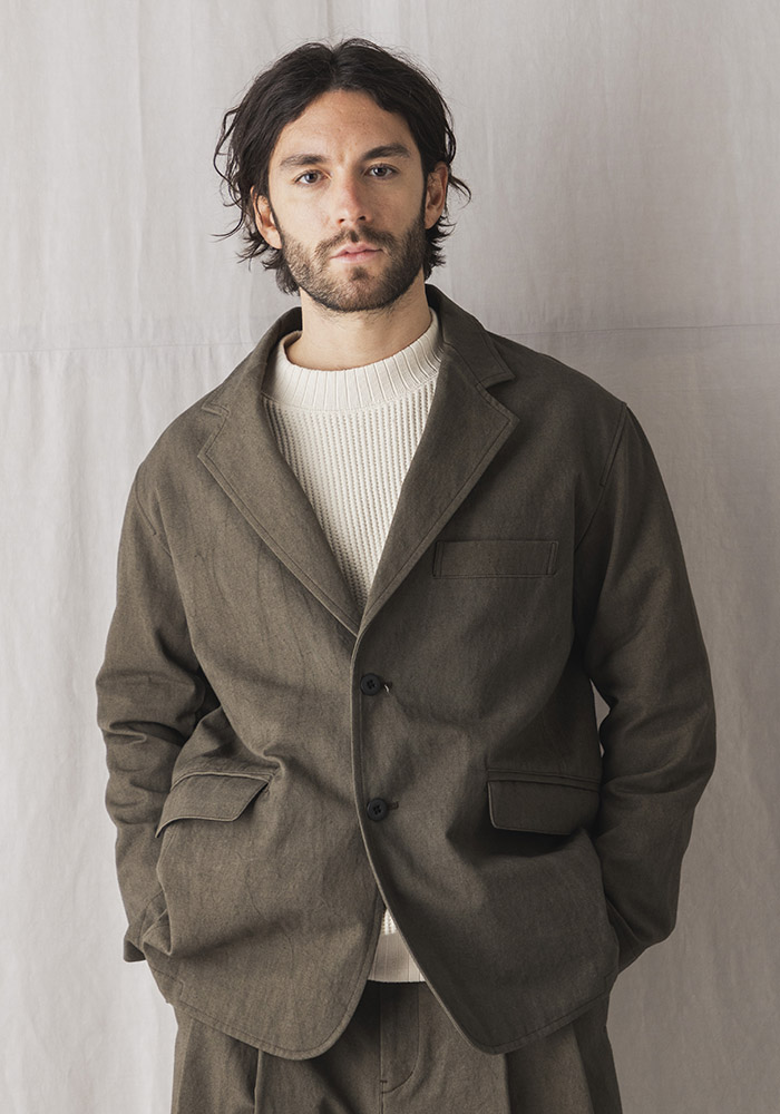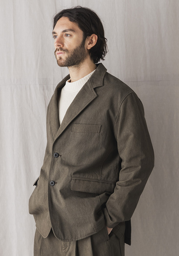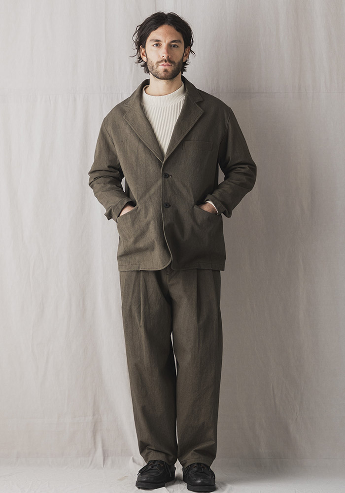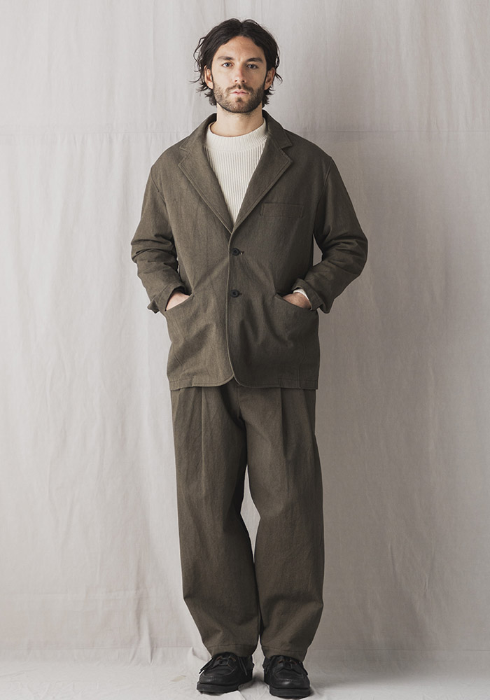 2013年リリースのルーキーパンツで使用している硫化染めのキャンバス織り布帛を使用したキャンバスジャケットです。硫化染めは通常の染色方法とは違い意図的にシワや色ムラ、スジを作るようにして染めるので粗野な素材がさらに無骨に見えます。デザインは1930年頃の野球選手やコミッショナーの間で流行ったややボリュームのある印象的な2ボタンテーラードジャケットをベースに垂れたコージラインとサイドベンツ、丸みのあるフォルムが特徴です。まだ寒さの残る2-3月のセットアップとしてリリースします。