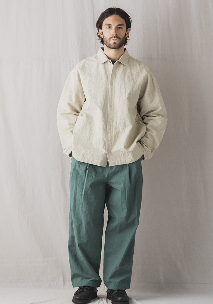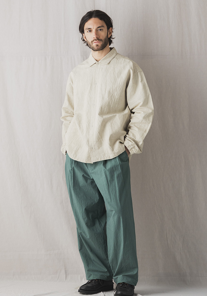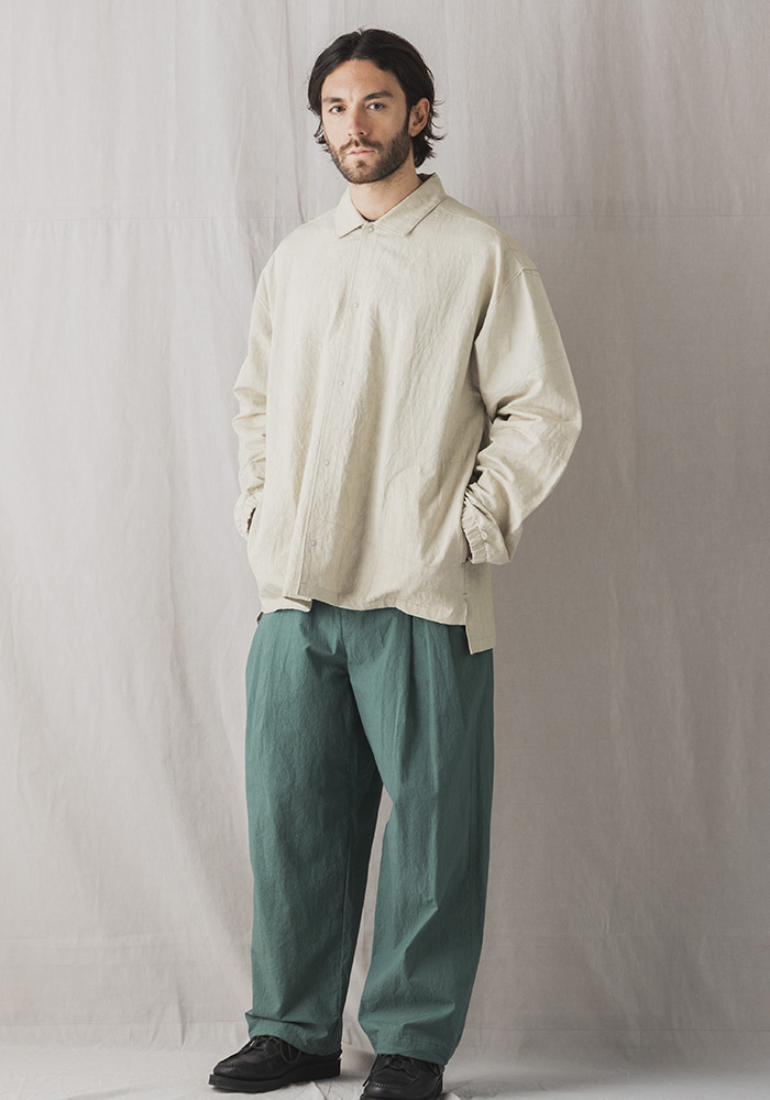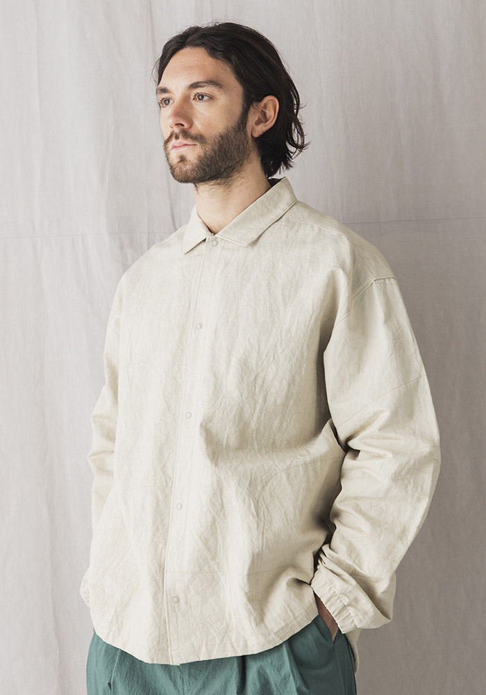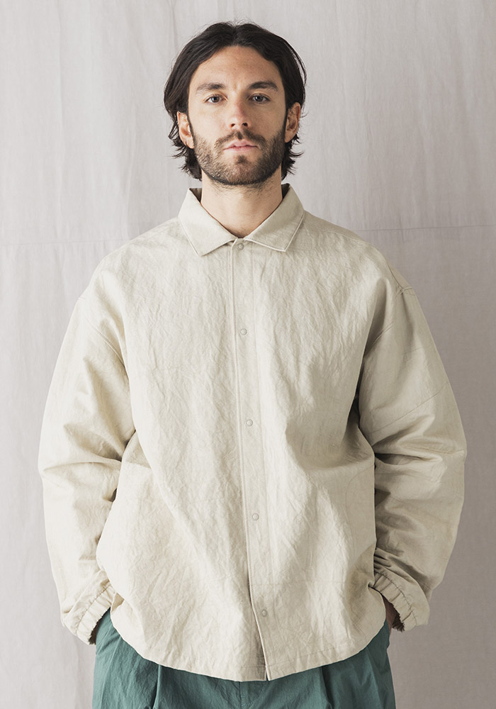 経糸に綿、緯糸に綿麻の混紡糸を使った特殊な素材で表と裏で綾畝の幅が異なるのが特徴です。その生地をシルケット加工や晒加工を省き彩度を抑えるために直接染料で小さな染め釜を使い染めるグランジウォッシュ加工。染色後の乾燥は天日でおこなうため手間と時間がかかりますが生地へのダメージが少なく洗いざらしの自然な表情になります。カミナリ模様の細やかなあたりが特徴的で肌への接地面も少なく夏まで快適に着用できる素材です。デザインはクラシカルなコーチジャケットを参考に肩パーツの二重づかい、背中のプリーツ、裾の段差サイドスリットなどシャツ仕立てならではの仕様にアレンジ。コーチジャケットのギミックに見られるリングドットボタンと袖口のゴムシャーリングを取り入れアウターとしての機能を考えたサイドシームのポケットを配しました。パーツごとに表裏を変えているので光の角度によって微妙に陰影が出て立体感のある表情に見えます。