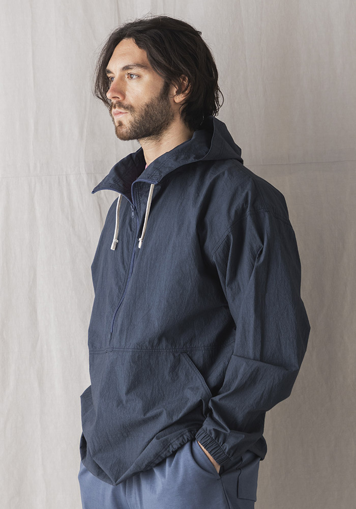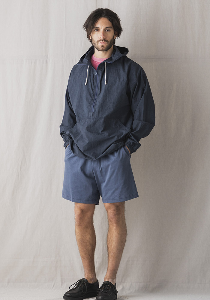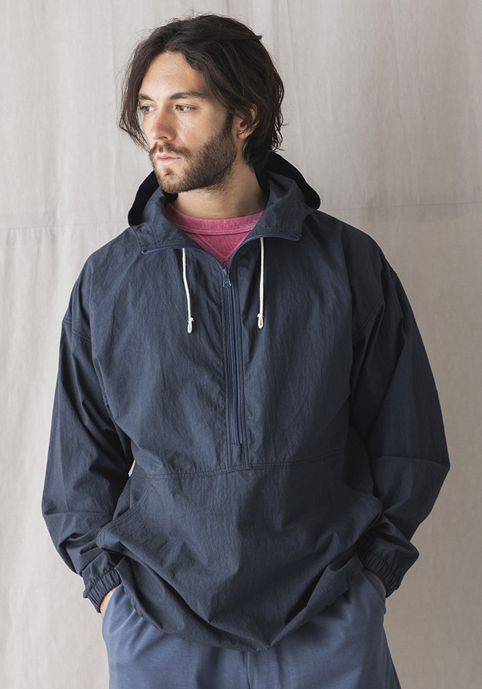 シルケット加工や晒加工を省き彩度を抑えるために直接染料で小さな染め釜を使い染めるグランジウォッシュ加工。染色後の乾燥は天日でおこなうため手間と時間がかかりますが生地へのダメージが少なく洗いざらしの自然な表情になります。カミナリ模様の細やかなあたりが特徴的で肌への接地面も少なく夏まで快適に着用できる素材です。デザインはBaseballの控え選手や交代した選手がベンチで着用する観戦用パーカを参考に肩幅の広いゆったりとしたシルエットにクラシカルなネックスピンドルを採用し風の侵入を防ぎます。