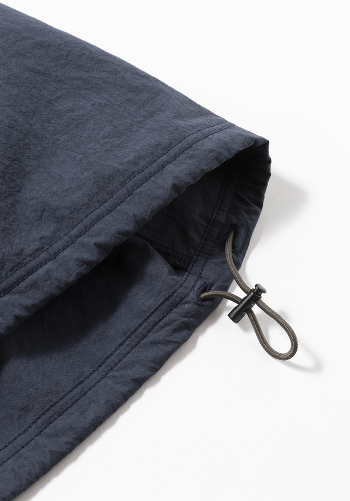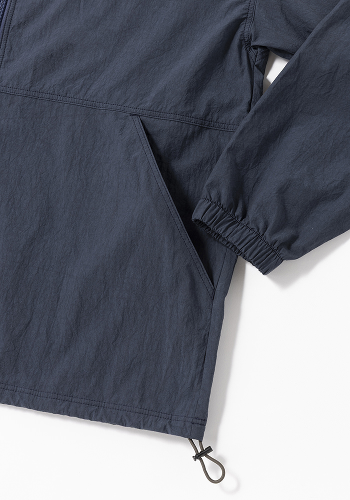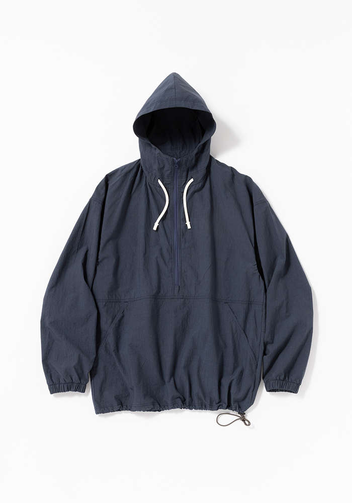 シルケット加工や晒加工を省き彩度を抑えるために直接染料で小さな染め釜を使い染めるグランジウォッシュ加工。染色後の乾燥は天日でおこなうため手間と時間がかかりますが生地へのダメージが少なく洗いざらしの自然な表情になります。カミナリ模様の細やかなあたりが特徴的で肌への接地面も少なく夏まで快適に着用できる素材です。デザインはBaseballの控え選手や交代した選手がベンチで着用する観戦用パーカを参考に肩幅の広いゆったりとしたシルエットにクラシカルなネックスピンドルを採用し風の侵入を防ぎます。販売予定日_3月