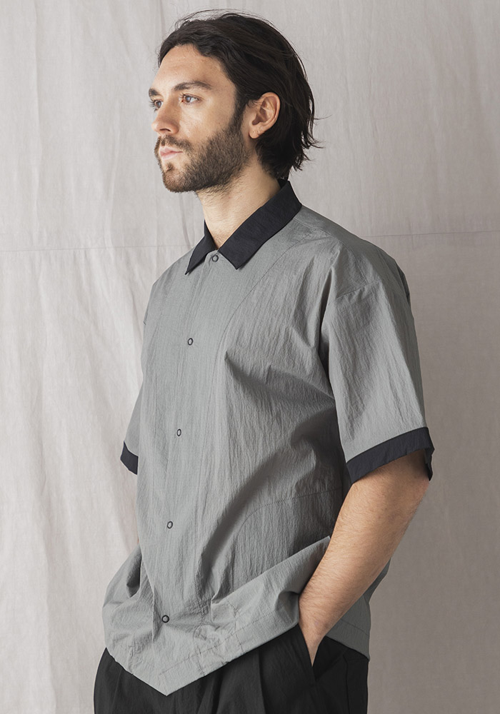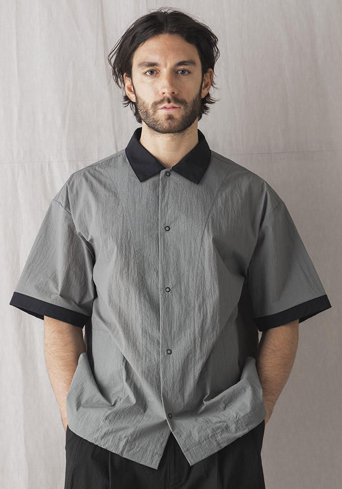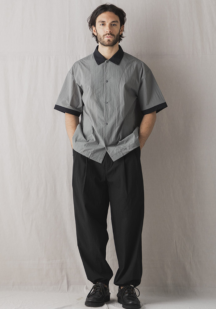 経糸に15D極細ナイロン、緯糸に80/1混紡の綿を使用し織り上げた乾燥感のあるクリスピークロス。天然素材の表情を出すために緯糸の綿は長さ35mm以上の超長綿だけを使用、光沢があり滑らかで軽量、乾燥感のある表面は見た目だけではなく洗濯後の乾きが早いのも特徴です。デザインは1940年代の襟付き野球ユニフォームを参考にしたBaseballシャツ。サイドにはシームラインを利用したポケットを配し、裾のゴムスピンドルを絞ることで丸みのあるシルエットと着丈の調節が可能です。発売予定日_4月
