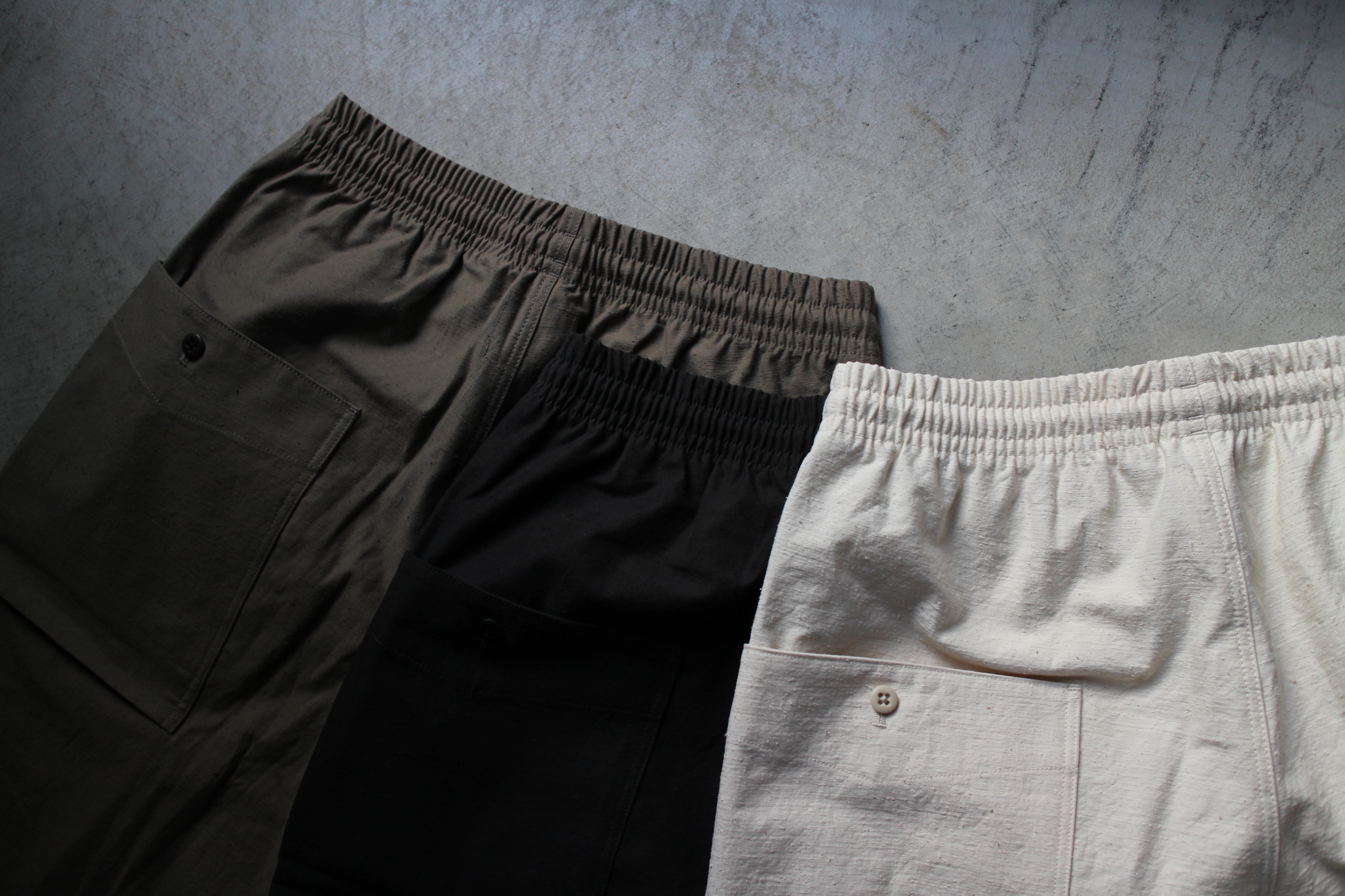 The Umps Pants is made of a high-density fabric woven with dry-looking nepped yarn. To give it a rough look, organic cotton yarn is woven as is without conditioning. The fabric is then scoured to give it a drier feel for summer wear. The design was inspired by baseball umpire pants, with large pockets situated between the waist and hips that could be used to hold spare balls.