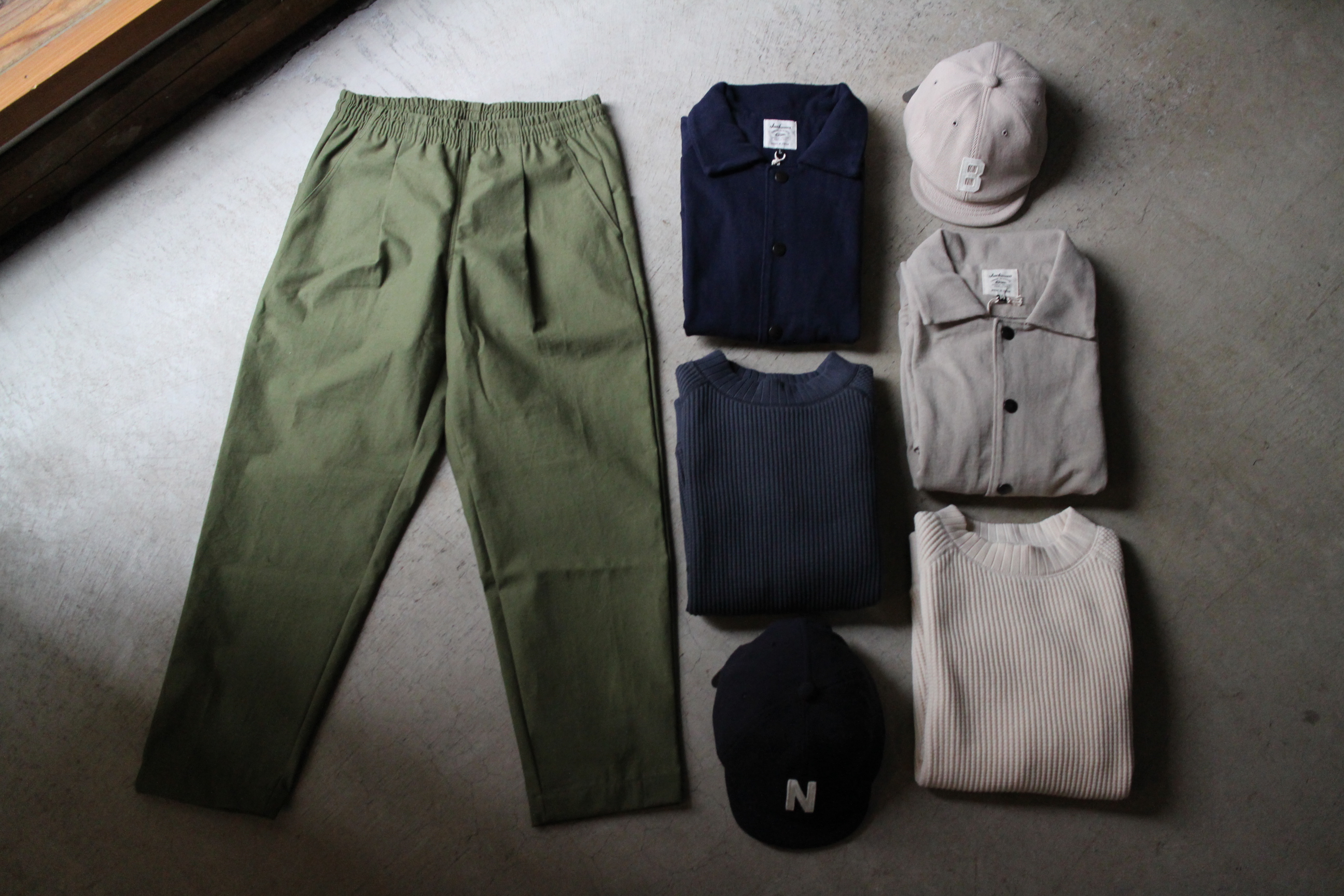 The Umps Pants is made of a high-density fabric woven with dry-looking nepped yarn. To give it a rough look, organic cotton yarn is woven as is without conditioning. The fabric is then scoured to give it a drier feel for summer wear. The design was inspired by baseball umpire pants, with large pockets situated between the waist and hips that could be used to hold spare balls.