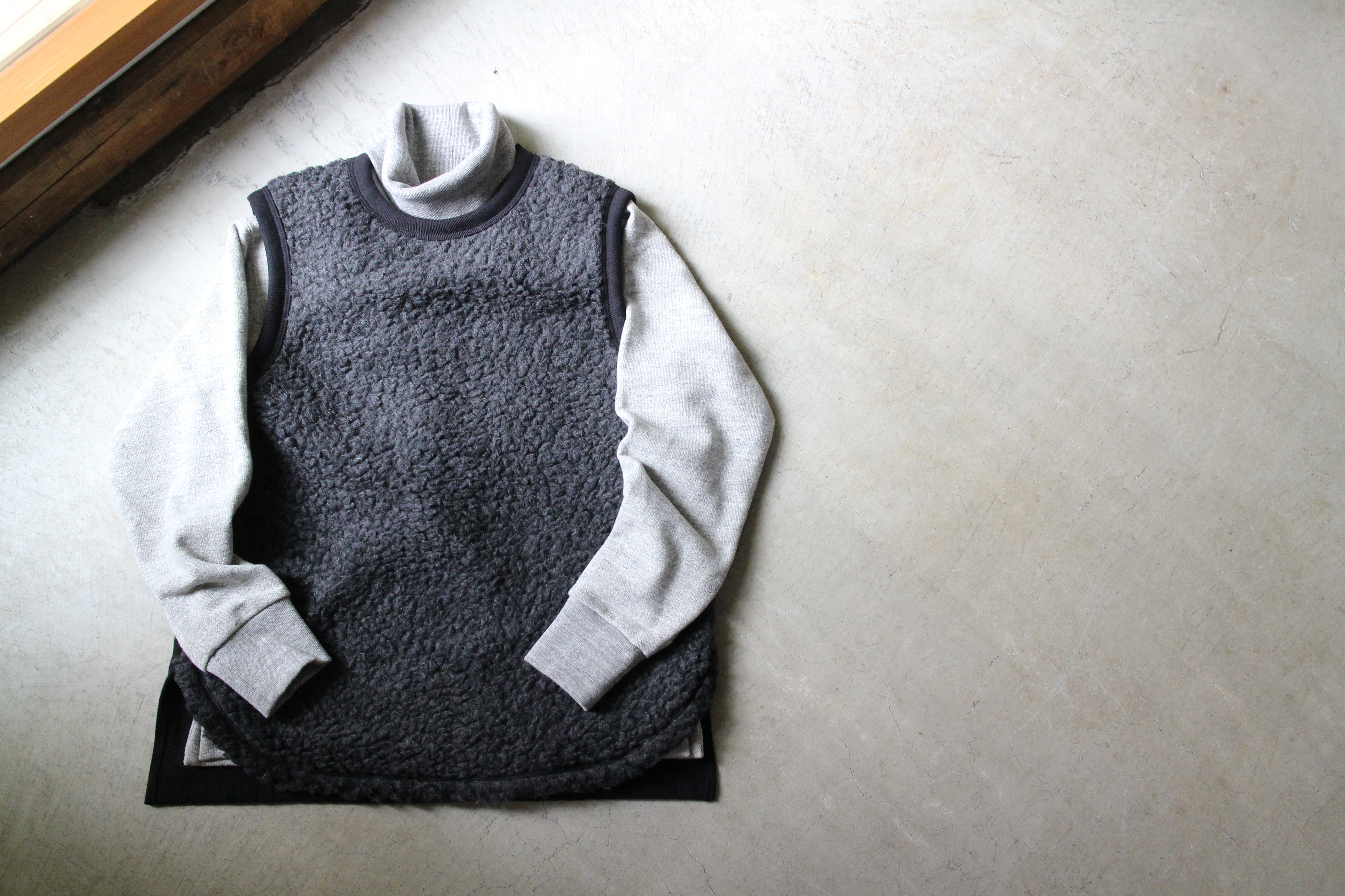 The Catcher Vest is made of sheep wool boa material with a distinctive boa look using our new Italian sliver knit material. The back uses a padded jersey material that traps warmth without being too bulky and is designed to keep the overall silhouette from becoming too large. The design is based on a baseball protector for guarding against pitches and ball strikes, with a curve at the front hem to show off the inner layer well.