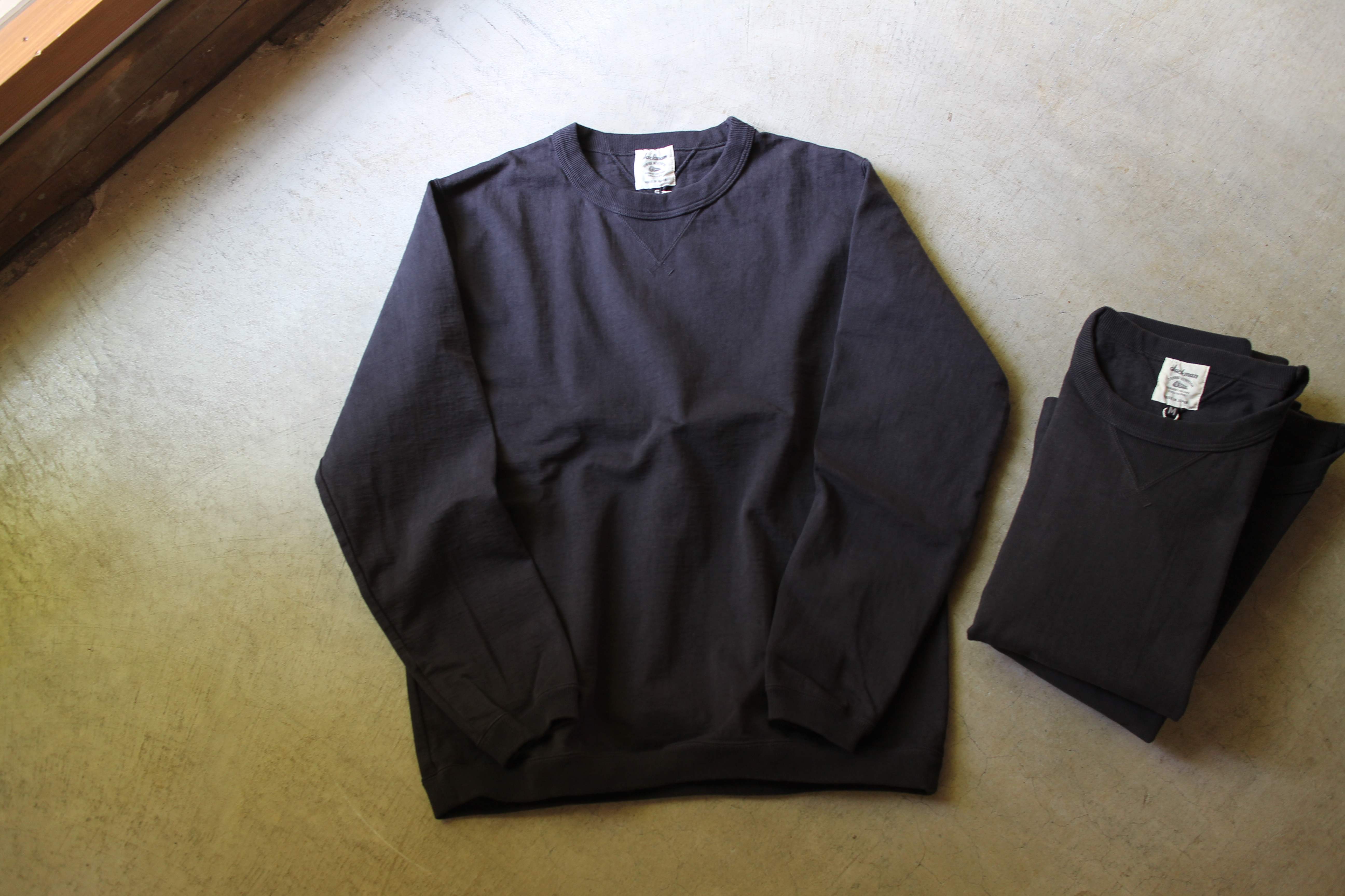 Dotsume Tenjiku jersey is painstakingly knitted with a high density, making it difficult to mass-produce. However, our slow knitting process using loopwheel knitting machines ensures consistent density, making the fabric less susceptible to shrinkage or distortion through wear and washing. The material is on the heavier side at about 11.5 oz, but this firmness means that it will cling against the skin less, allowing the T-shirt to be worn comfortably starting around early autumn. The distinctive ribbing around the neckline, wrists, and hem gently shapes the garment, creating a rounded silhouette. The result is a versatile Dotsume Rib Long Sleeve T-Shirt that pairs well with many bottoms.
