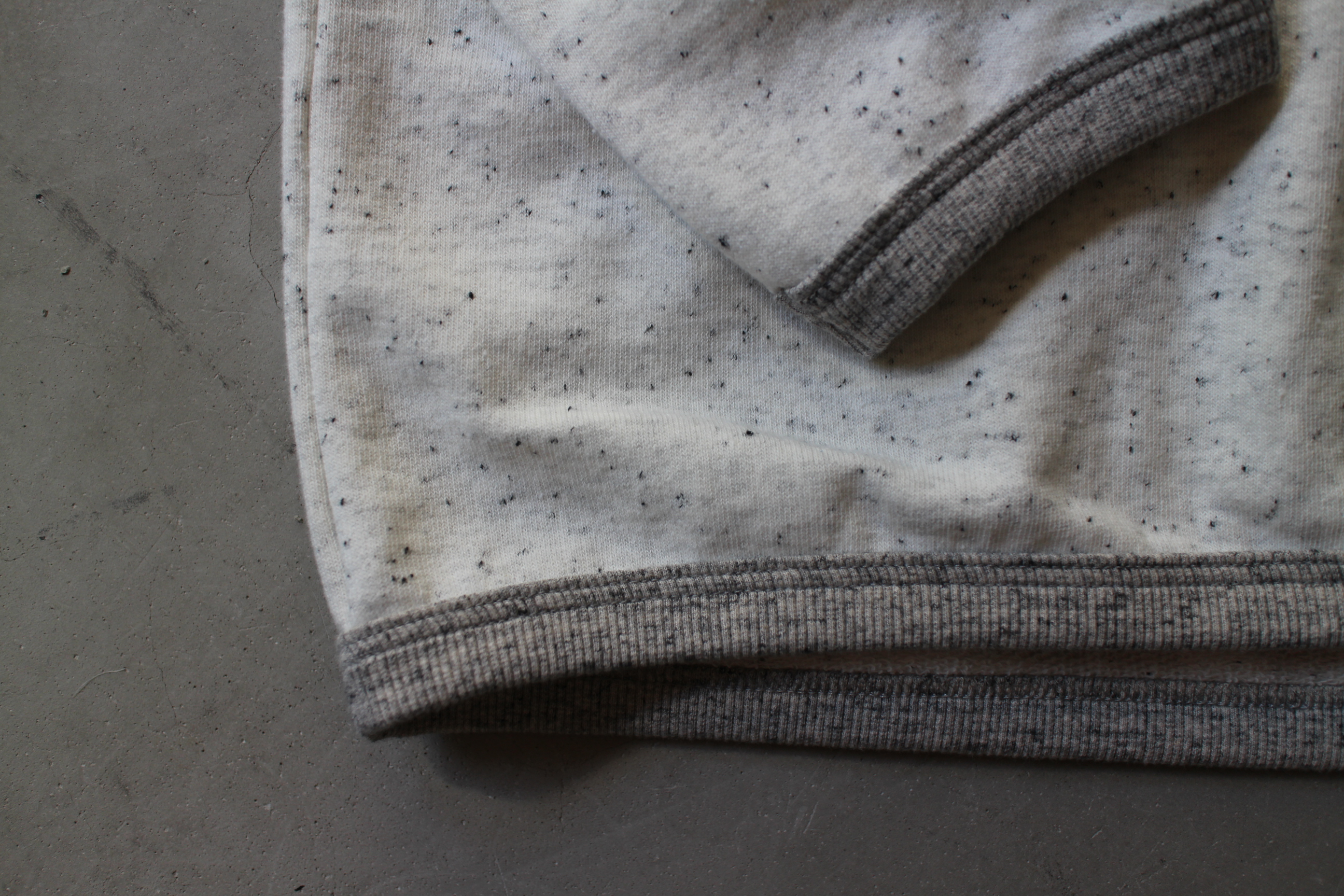 This sweat crewneck shirt is made from a medium-weight back yarn, with a balanced blend of 20/1 U.S. cotton and polyester thread for the front yarn. For knitting, we used a knitting machine from Azuma Co., which creates a puffed texture. The silhouette has been designed to have a rounded form by applying binder processing to the neckline and cuffs. This product uses a dye that colors only the cotton, leaving the polyester thread white, creating a salt-and-pepper-like pattern akin to wood grain and a light appearance. It's a thinner material than our GG French terry sweatshirt, making it suitable to wear throughout the spring.