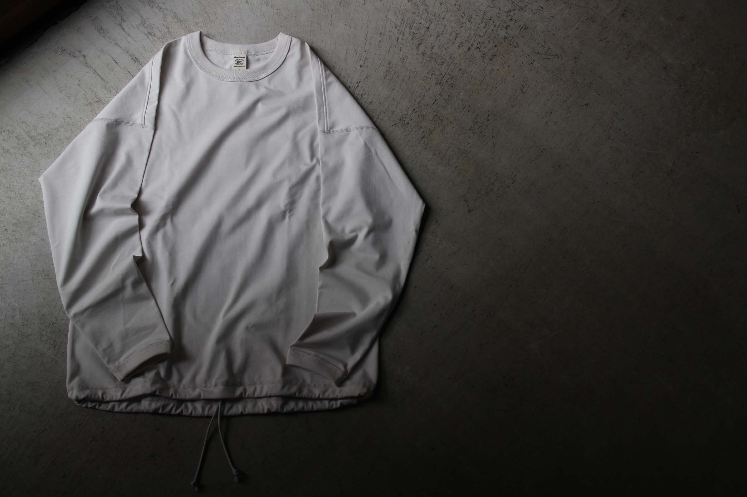With a smooth feel against the skin that you would not expect from 100% cotton, this is a special plain knit fabric made after dissolving the cotton fibers until smooth using special techniques. The hem is designed to be squeezed with a draw string, you can arrange the silhouette, it is a T-Shirt which looks good even if you wear it in one piece. The flat seam sawing also makes it comfortable for you to wear.