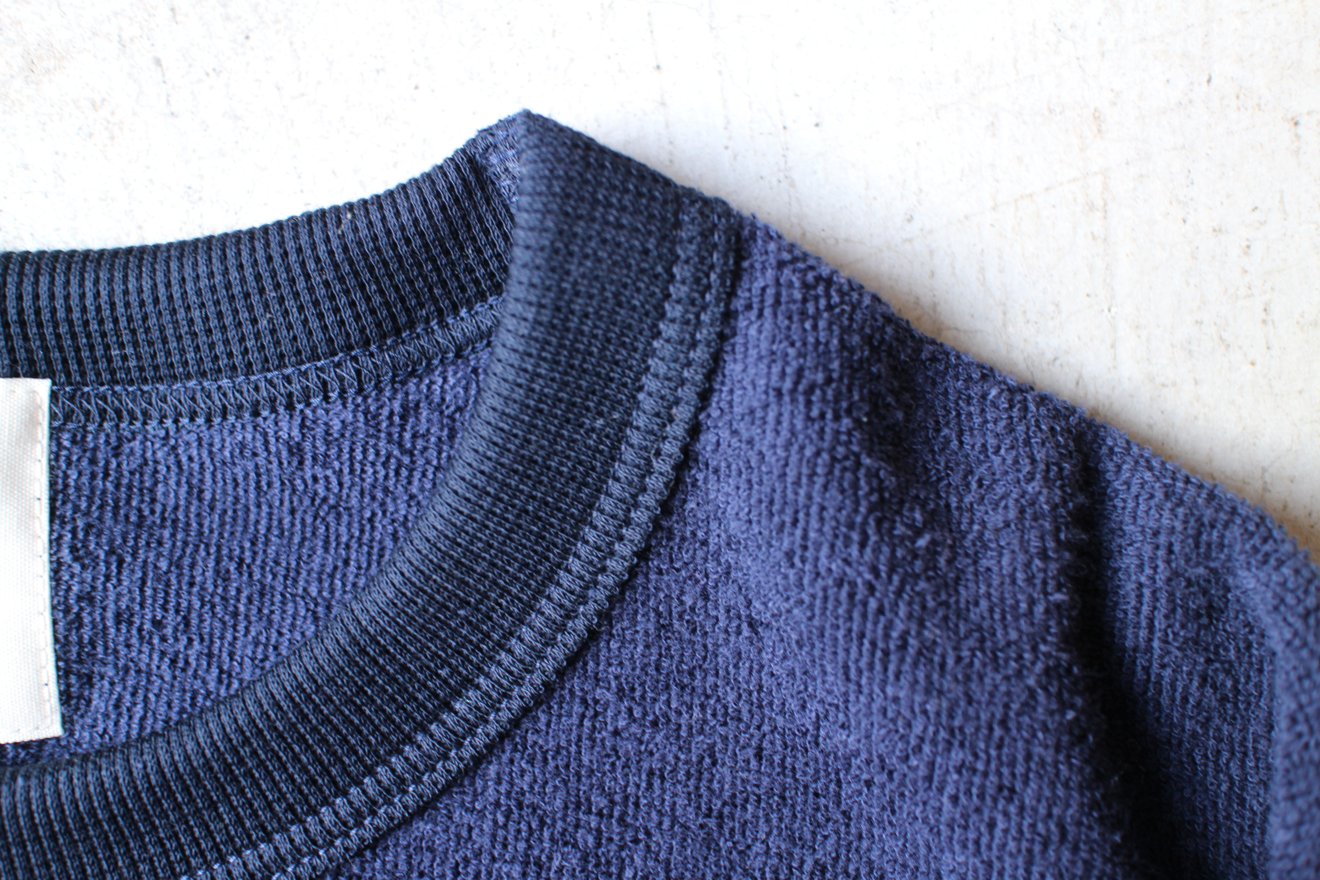 This long-sleeved Himo T-shirt is made with knit pile featuring distinct loop shapes on both sides. The loops are less loose than in standard pile fabrics, resulting in a material with a firmer feel. It's knitted using a machine that ceased production 40 years ago, allowing you to enjoy its classic look. The design is inspired by practice wear with an adjustable cord at the hem, reminiscent of garments worn while swinging the bat during pre-game batting practice.