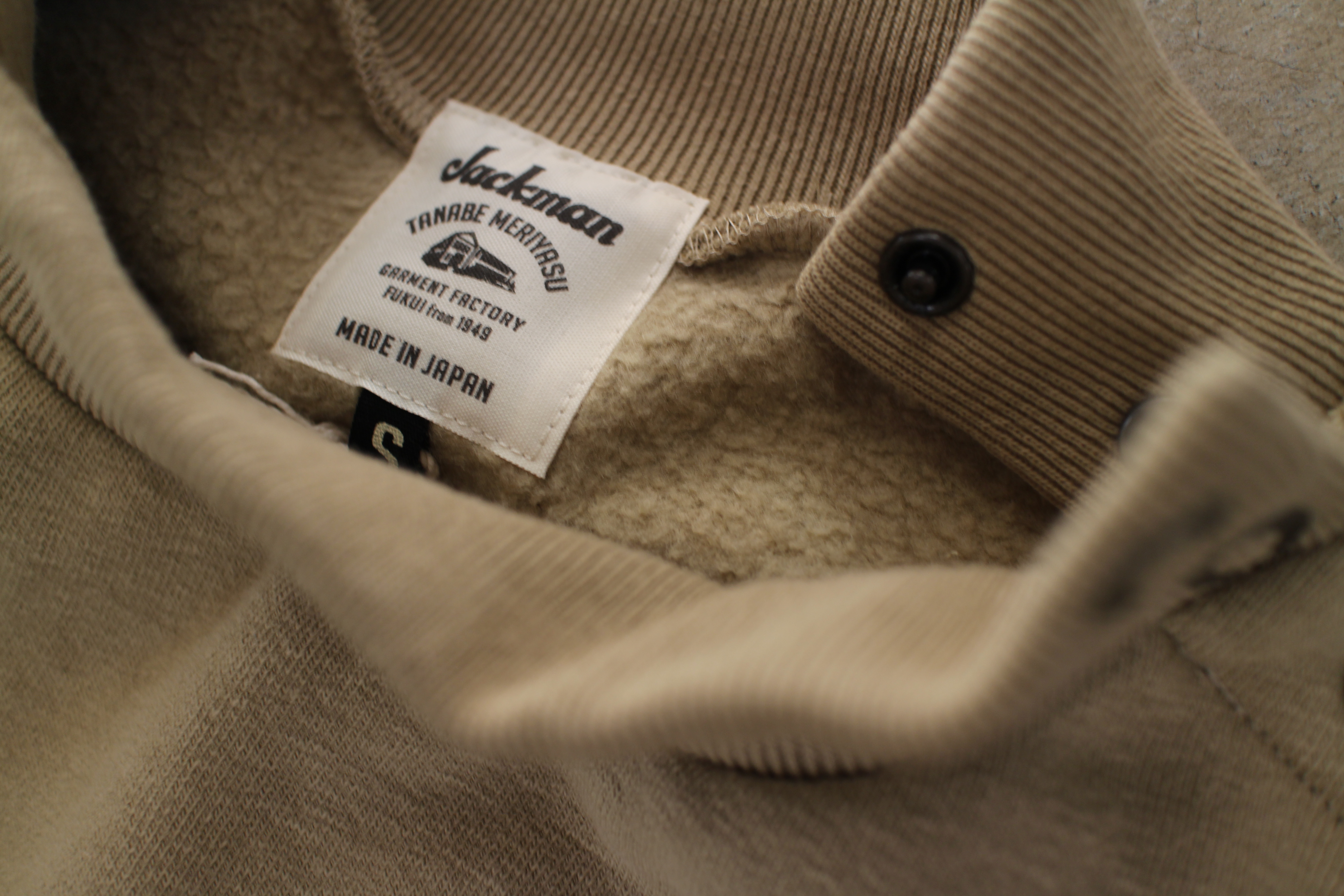 Our raised back Sweat Midneck is made with cotton yarn coated with polyurethane on the front and middle yarn, giving it stretchability. Using a rare Azuma knitting machine, we utilized the shrinkage power of polyurethane to create a distinct condensed feel, giving it the impression of being densely packed. The design has a relaxed fit inspired by the rugged silhouette of baseball cold-weather training wear that emerged in the 1920s to 1940s, so it can be worn alone. The voluminous sleeves were designed with triangular parts to minimize fabric waste, and the shoulder side can be opened and closed with a thick ring snap button, making it easy to put on and take off. You can wear this winter sweatshirt without relying on outerwear even on cold days.