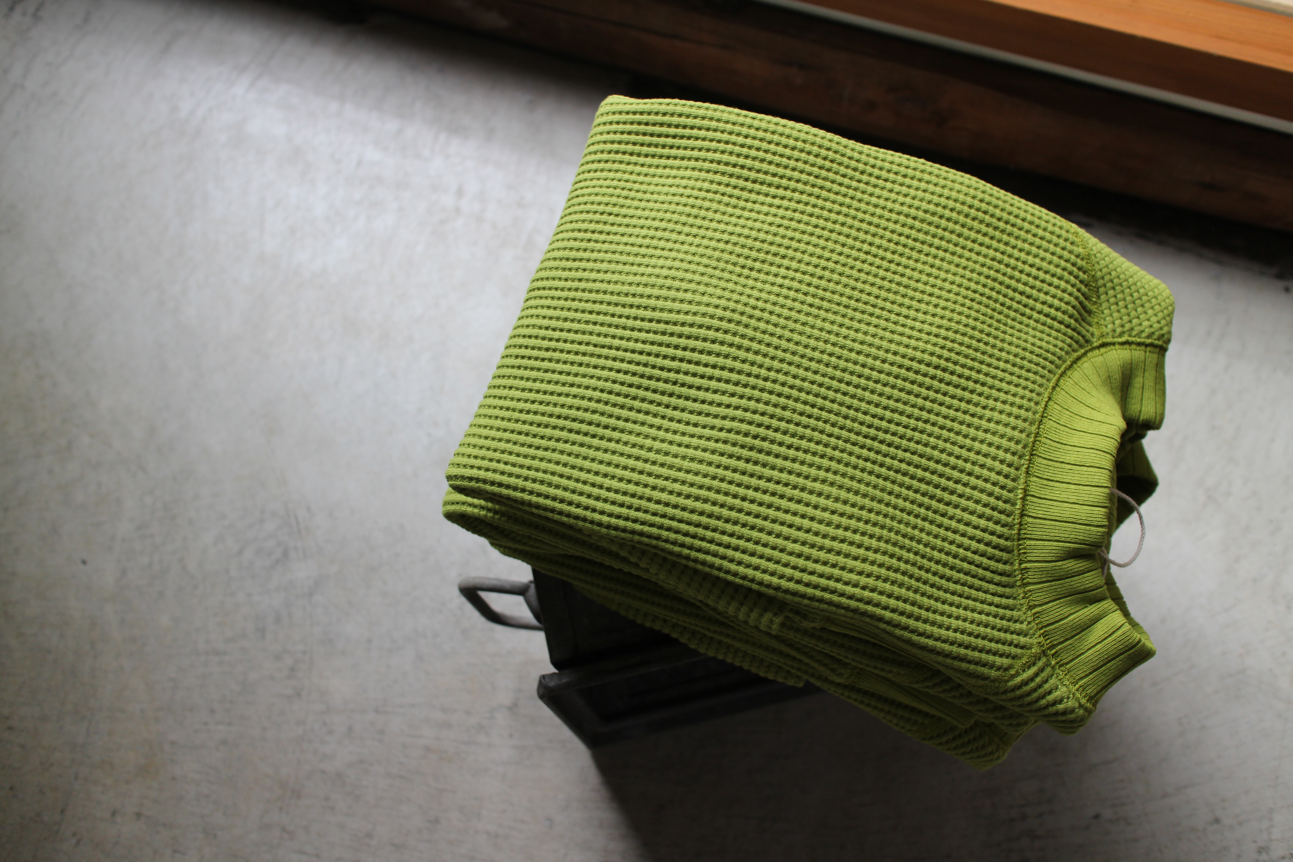 The Midneck shirt uses waffle fabric with highly-raised ridges, made by knitting (paralleled) 19//1 Raffy cotton yarn with a double jacquard machine. Raffy is a recycled yarn made from cotton waste, and its distinctive unevenness gives it a classical look. Additionally, in order to prevent distortion and shrinkage due to wear and washing, the fabric is unrolled and allowed to fully relax before being cut and sewn. The main parts are sewn together using flat seams, ensuring that the material lies flat when the shirt is worn and places minimal stress on the wearer’s skin. For the neckline, cuffs, and hem, a stiffer, yet lightweight drop-stitch rib knit was sewn with a triple needle stitch to prevent stretching during washing and wearing. The comfort of 100% cotton and the plush, thick construction give this piece a simple yet unique look. The new “lime” color was inspired by the lime slices that spectators drop into their beer during games.