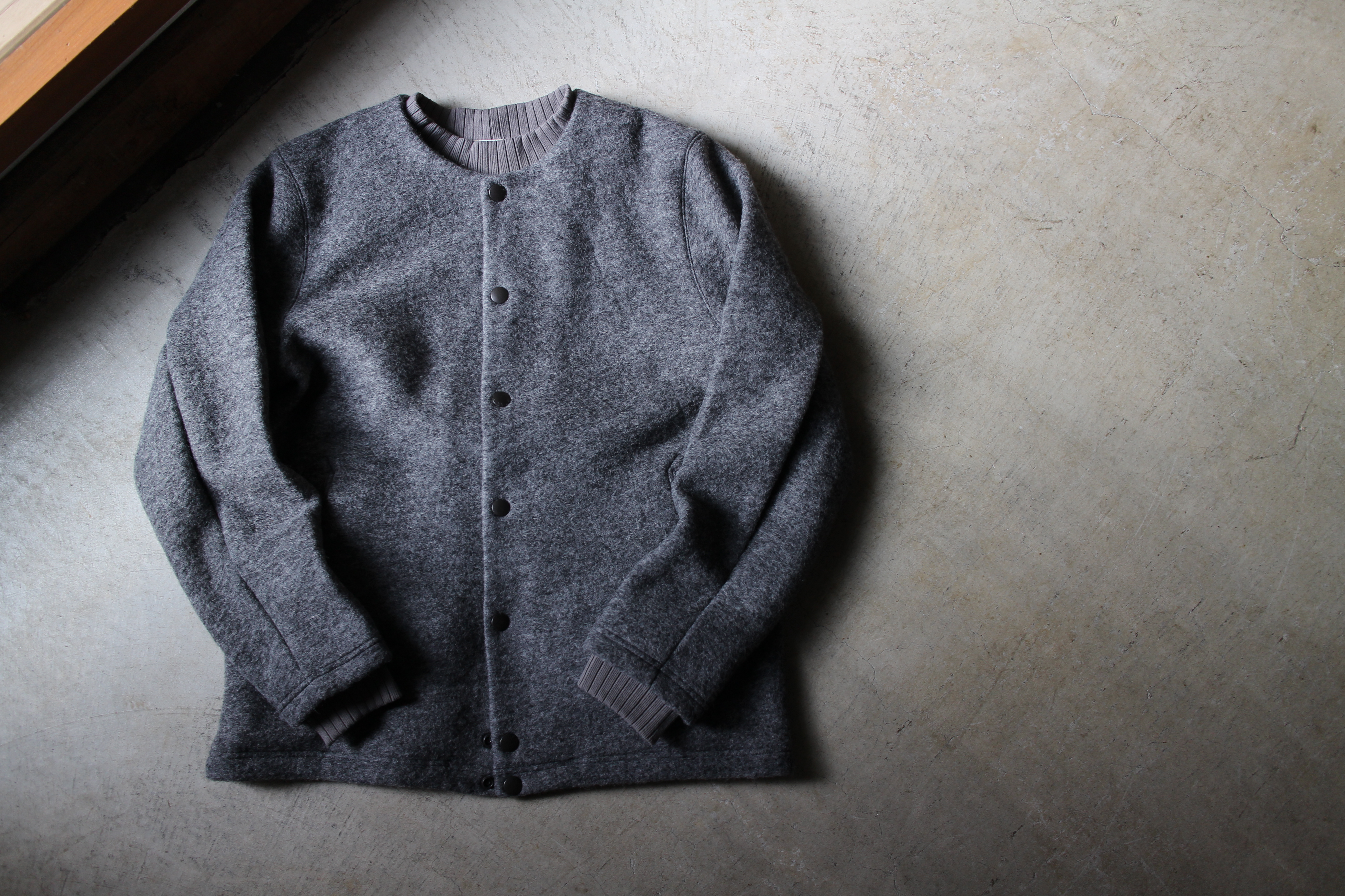 Scottish Shetland wool, produced by sheep fed a diet mixed with seaweed, features a soft, thick texture that guards against harsh cold and humidity. This Collarless Jacket features wool twisted loosely into yarn, then knitted into a bulky fabric that keeps warm air trapped in its fibers. This distinctive design is inspired by baseball uniforms and reflects Jackman’s DNA. Because it features no collar, this jacket gives your inner layers such as midnecks, parkas, and highnecks full visibility, offering a variety of combinations for you to enjoy.